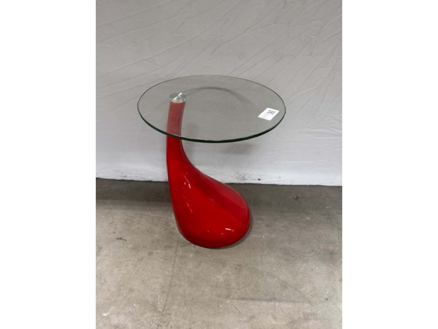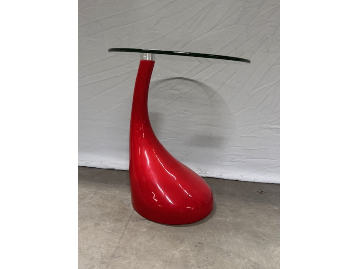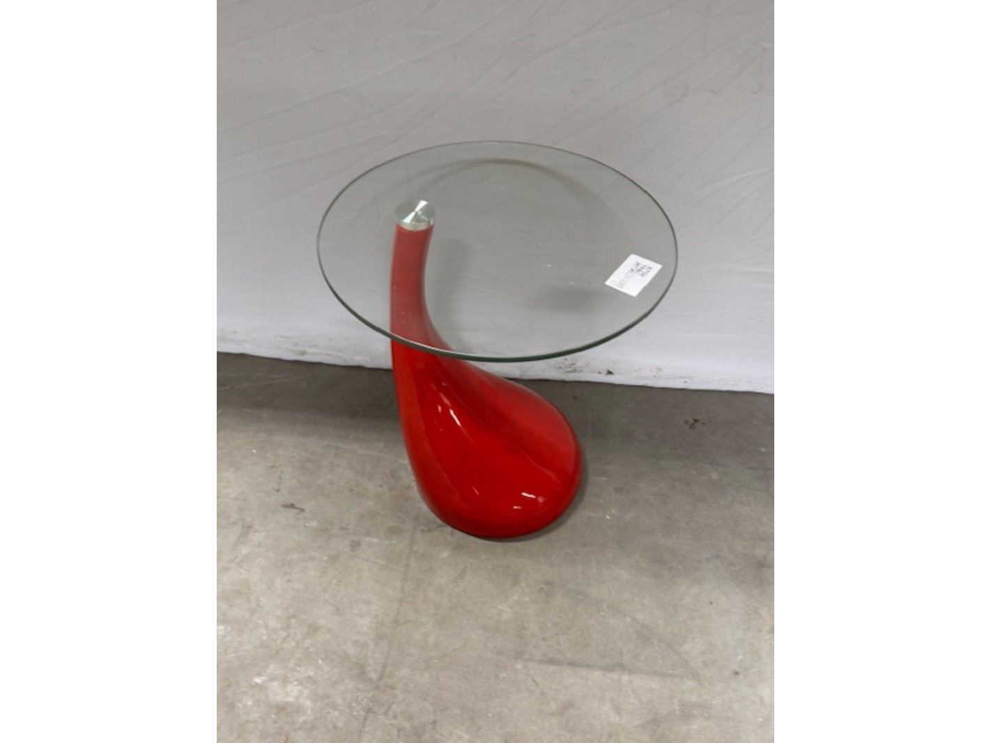 Product: Bijzettafel Kleur: rood Materiaal: glas Afmeting: bxh ca. 45x53cm Conditie: gebruikt