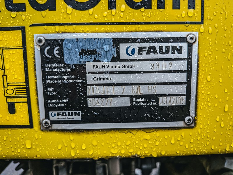 Merk: DAF Product: Wegdekreiniger BouwJaar: 2015 Specificaties: Basis kenmerken Kenteken: 68-BGD-2 Datum eerste toelating: 17 juni 2015 Vervaldatum APK: 17 juni 2026 Afgelezen tellerstand: 232.073 km (RDW logisch) Carrosserie: Straatveger, straatreiniger, rioolzuiger Aantal zitplaatsen: 2 Aantal sleutels: 4 (waarvan 2x reservesleutel) Motor, Prestaties & Milieu Brandstof: Diesel Motorcode: PX-7 186 H1 Aantal cilinders: 6 Cilinderinhoud: 6.700 cm³ Max. vermogen: 180 kW / 245 PK Transmissie: Handgeschakeld Emissiecode: Euro 6 Maten & Gewichten Voertuig lengte: 6.700 mm Voertuig breedte: 2.550 mm Wielbasis: 3.600 mm Massa rijklaar: 10.509 kg Max. massa voertuig: 19.000 kg Laadvermogen: 8.591 kg Kenmerken opbouw Merk: FAUN Type: VIAJET V7 R/L HS Serienummer: KTR.304277 Bouwjaar: 2015 Urenstand: 11311 Opties, accessoires & opmerkingen • Voertuigstabiliteitsregeling (VSC) • Achteruitrijsignalering • Basis startblokkeringssysteem • Vooras 7,5 t, paraboolvering, 152N • Achteras 11,5 t, luchtvering, SR1132 • Goodyear banden • Vooras 315/80 R22 FMAXS 146/150 L Steering BB71-2 • Achteras 315/80 R22.5 FMAXD 156/150 L Traction CB72-1 • Reservewiel 315/80 R22.5 FMAXD 156/150 L Traction CB72-1 • PX-7 motor, 186 kW/253 pk, embleem op cabine 250 • Uitlaatemissie Euro 6 • Geen motorstop na stationair draaien • Handgeschakelde versnellingsbak, 9 versnellingen • Achterasverhouding 4,56 • Mechanische differentieelblokkering • ASR • Uitlaatrem • Wielbasis 3,60 m / achteroverbouw 1,48 • Langsligger 270/7,0 mm, zonder versteking • Standaard opstelling componenten • DPF/SCR unit achter cabine, verticale uitlaatmonding • Kunststof brandstoftank 200 l, brandstoftank links • Antispatwatermatten • Onderrijbeveiliging voor (FUP) • Onderrijbeveiliging achter • AdBlue tank 25 l, links achter cabine • Accubak links, geen reservewieldrager • Achterlichteenheid met lampen • Dwarsbalk D100-Dc70-V25, geen koppeling, los • Connector analoge motortoerentalregeling chassis • Opbouwermodule (BBM) full • Applicatieconnector vuilniswagen • Standaard gatenpatroon voor opbouwbevestiging • Bediening analoge versnellingsbak PTO, zonder PTO • Dynamo 100 A, accu's 2x 125 Ah • Totaal voertuiggewicht max. 19.000 kg • Treingewicht max. 22.500 kg • Typeplaatje EU • Solo uitvoering • Gematigd klimaat • Max. omgevingstemperatuur 38 graden • Vochtafscheider, onverwarmd • Luchtinlaat op het dak