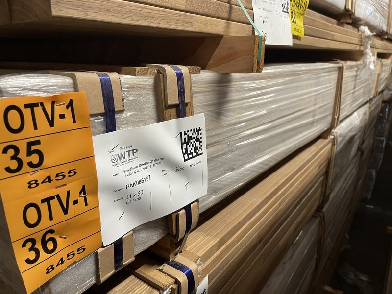 Product: Guyana Teak dekdelen gevingerlast Materiaal: Basralocus Afmeting: 21x90mm, lengte 400cm Conditie: nieuw