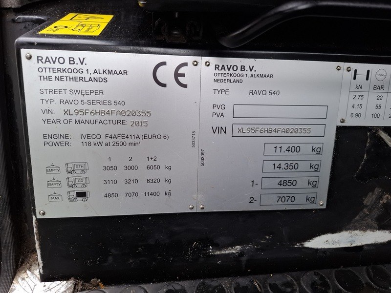 Merk: Ravo Product: Veegmachine BouwJaar: 2015 Conditie: Gebruikt Specificaties: Algemeen 1ste registratie: 17-12-2015 Afgelezen tellerstand 1: 59662 km Afgelezen tellerstand 2: 14542.6 km Bouwjaar: 2015 Chassisnummer: XL95F6HB4FA020355 Brandstof: Diesel Euronorm: Euro 6 Motorvermogen: 160pk / 118kw Transmissie: Automaat Accessoires - Achteruitrijcamera - Airconditioning - Camera met monitor - Euro 6 - Radio cd speler - Vangmuil - Zwaailampen Opmerkingen - Inhoud 5m³ - Iveco (type F4AFE411A) dieselmotor - Hogedrukpomp General (type TS1511) - Hogedrukhaspel met spuitlans - Slechts 9506 motoruren - Slechts 4316 veeguren - Ex-gemeente voertuig! Zie laatste afbeelding voor verdere technische informatie