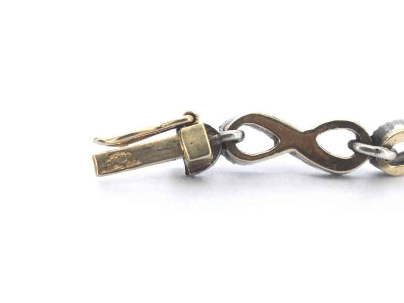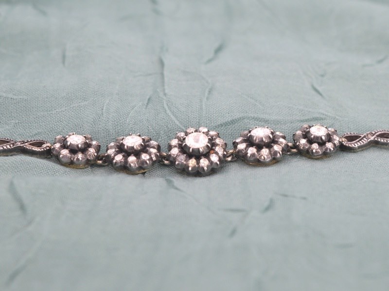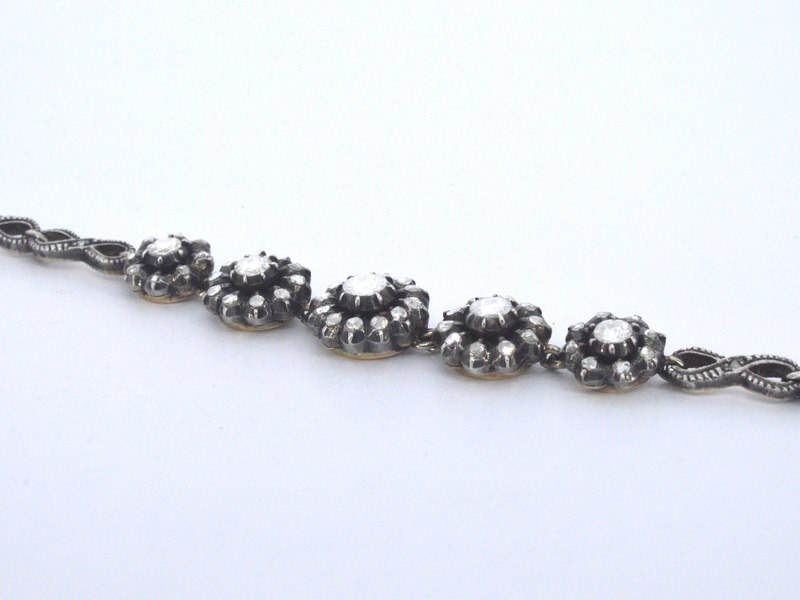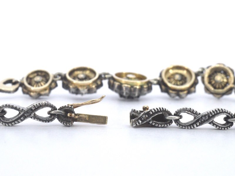 Product: Vintage armband met natuurlijke diamanten Specificaties: Diamant: Natuurlijk Slijpvorm: Roos geslepen Gewicht (carat): 1.00 carat Kleur: Wit Zuiverheid: Hoge zuiverheid Slijpkwaliteit: Goed Juweel: Armband Gewicht: 15.8 gram Afmetingen/lengte: 17 cm Materiaal: 14k goud (585) en zilver Conditie: Vintage Verpakking: Luxe sieradendoos Toelichting: De kwaliteit is overgenomen van het rapport behorend bij item. De waardebepaling is een beoordeling van een gecertificeerde diamantair, gebaseerd op consumentenprijzen. Consumentenprijs: € 5.900,-