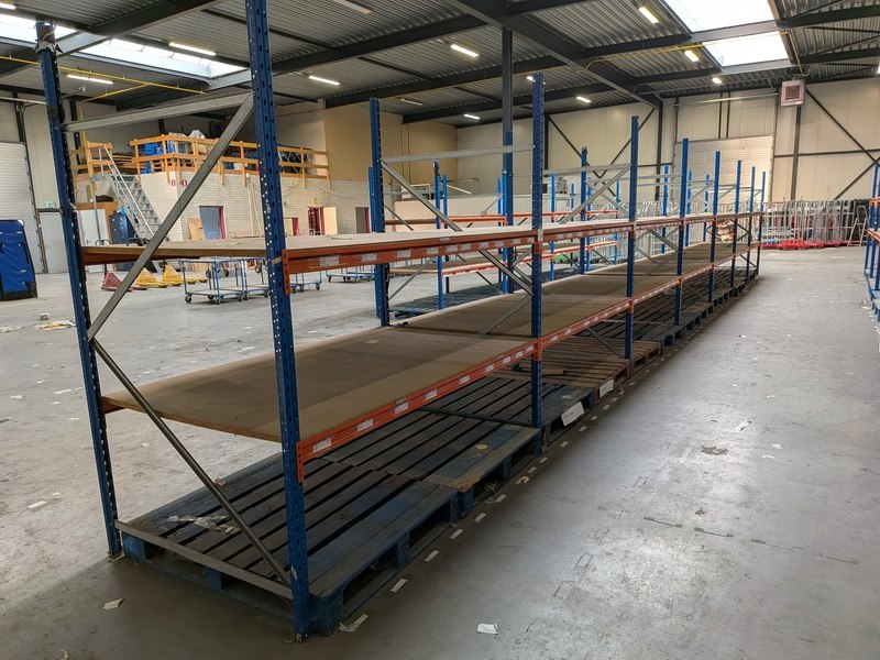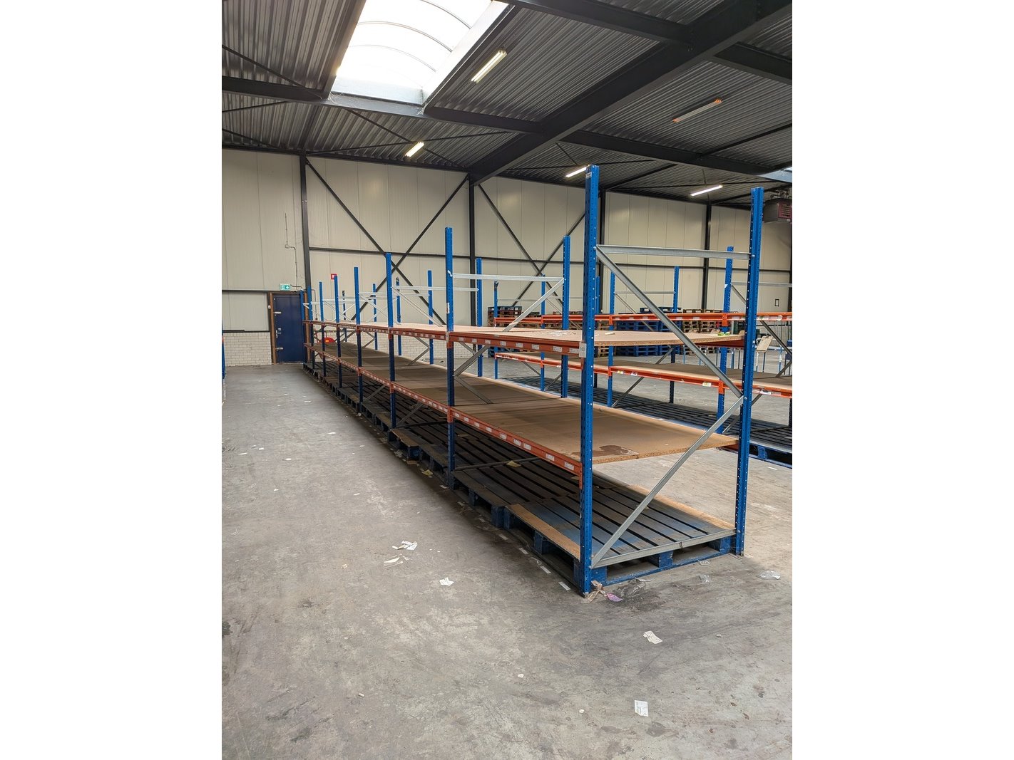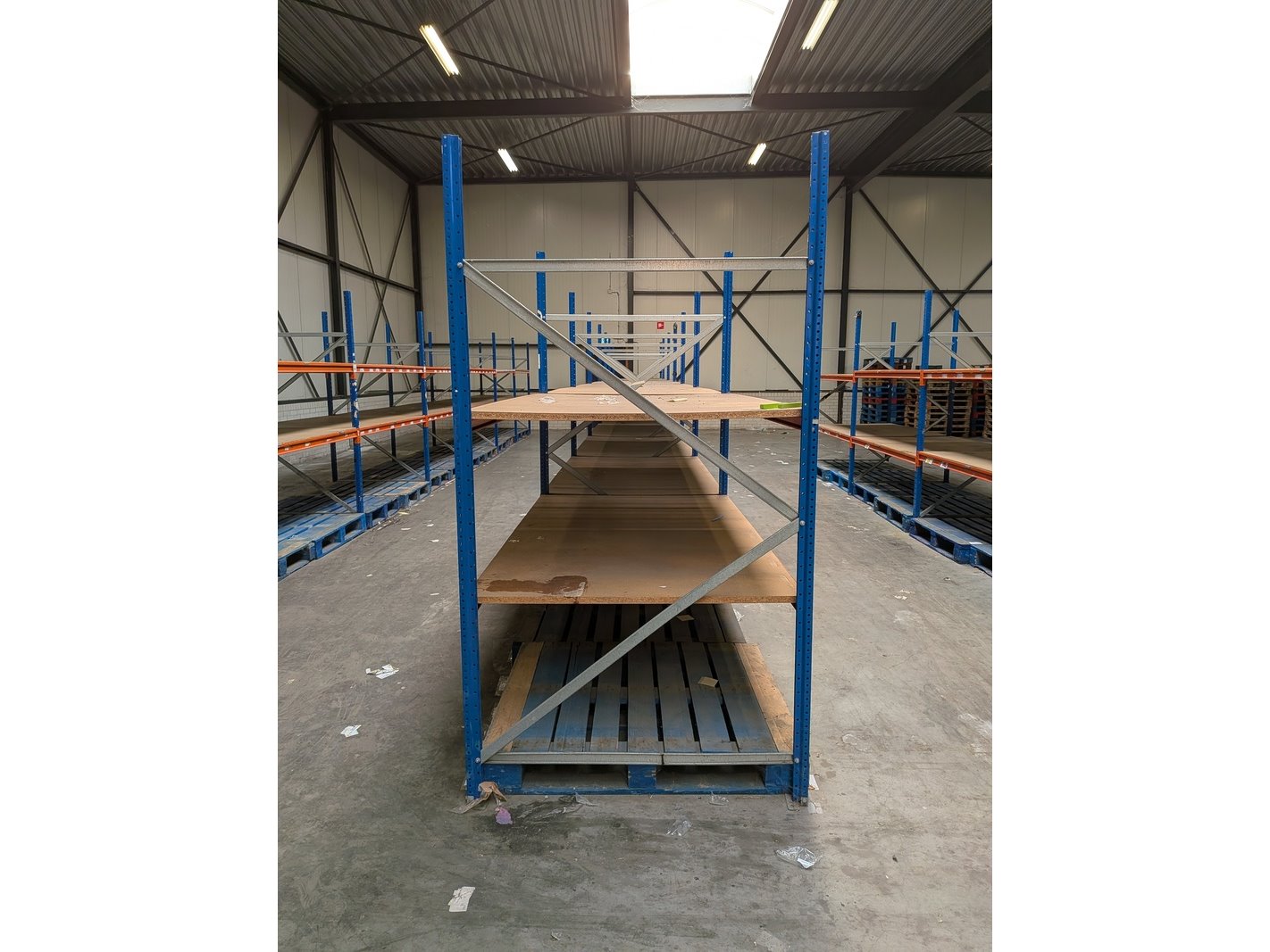 Product: Stellingmateriaal Specificaties: Bestaande uit: 28x ligger, lengte ca. 206cm 8x staander, hxb ca. 225 x 120 cm 14x legbord 14x pallet