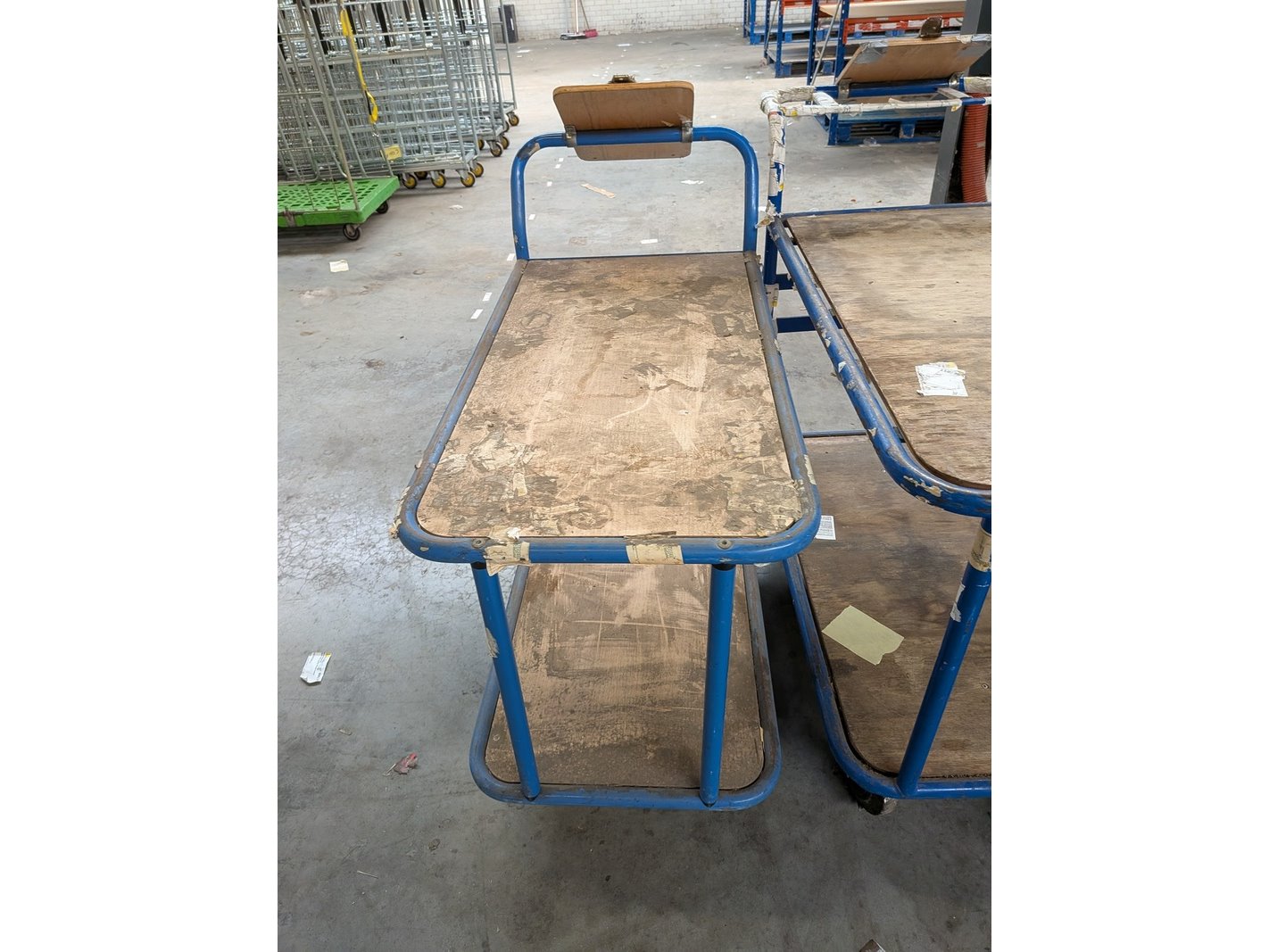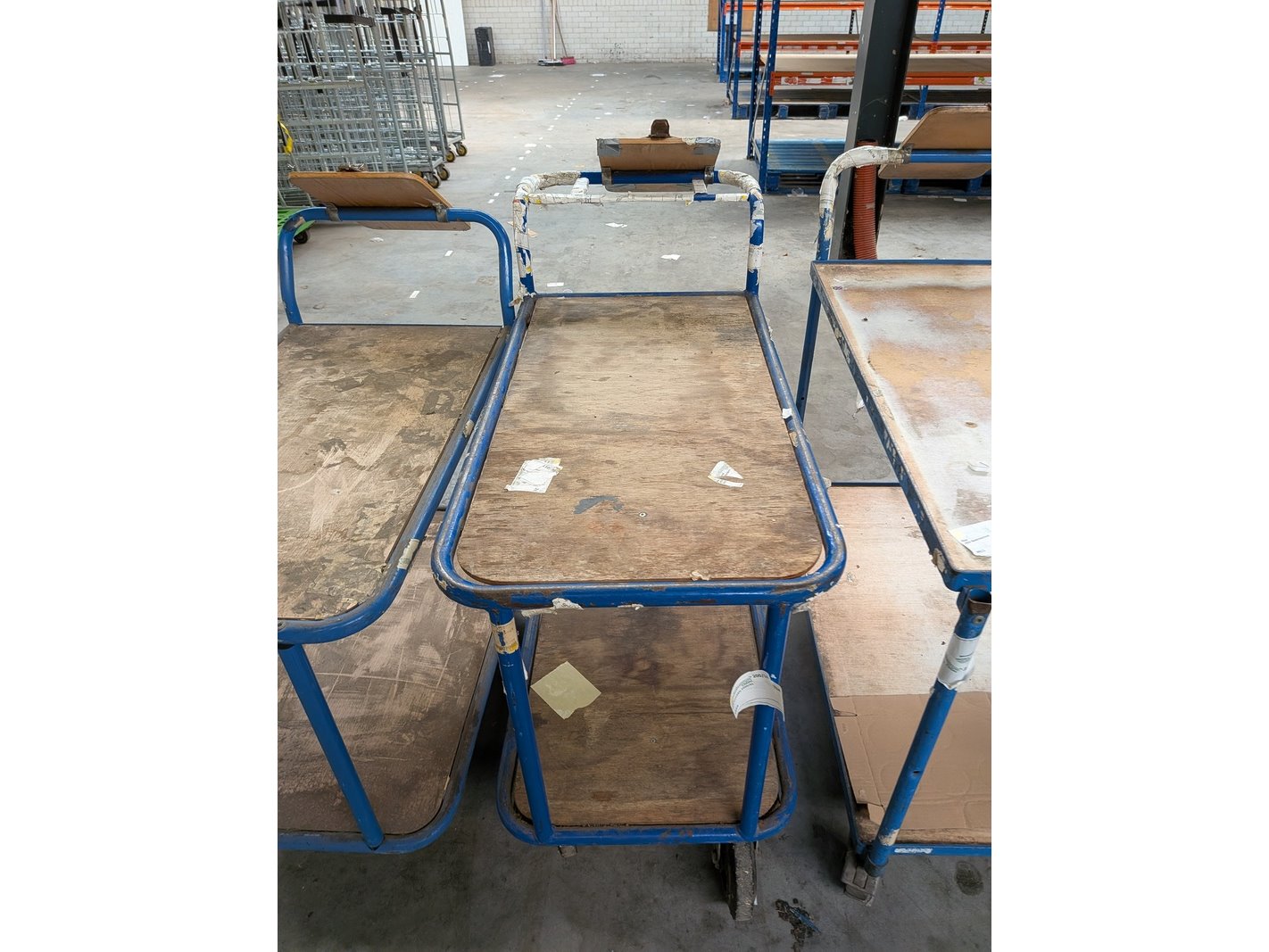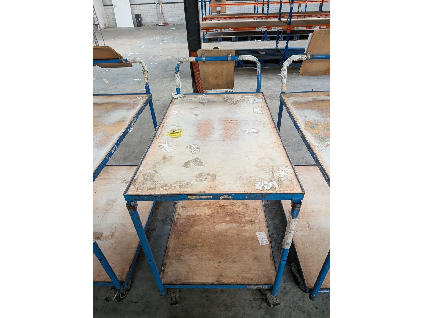 Product: Magazijnwagen Materiaal: Metaal / hout Specificaties: Waarvan 6x afmeting (lxbxh) ca. 114 x 61 x 104 cm