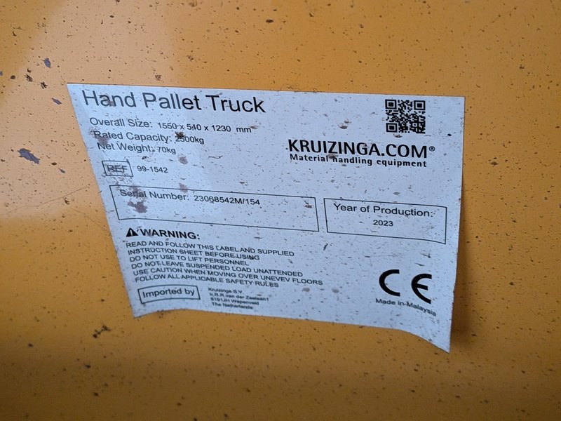 Merk: Kruizinga Product: Palletwagen Afmeting: max. 2500kg BouwJaar: 2023 Specificaties: lepellengte ca. 114 cm