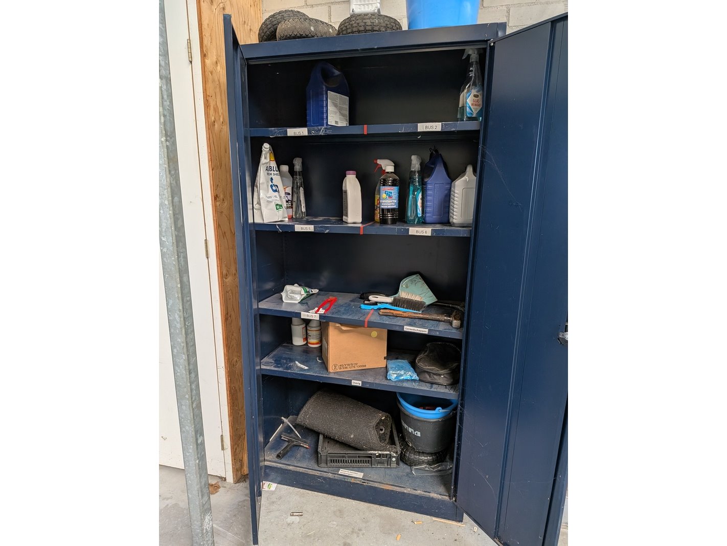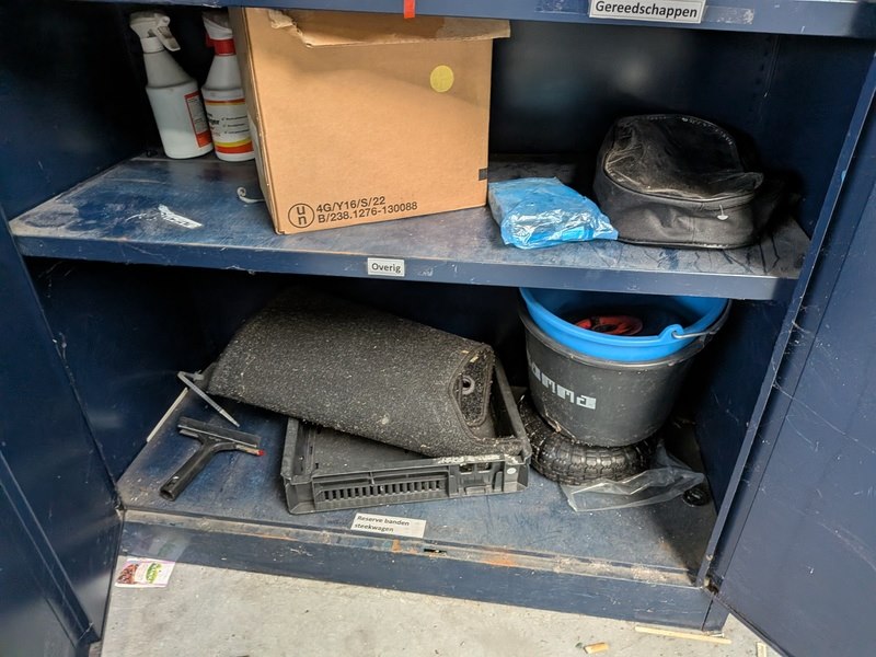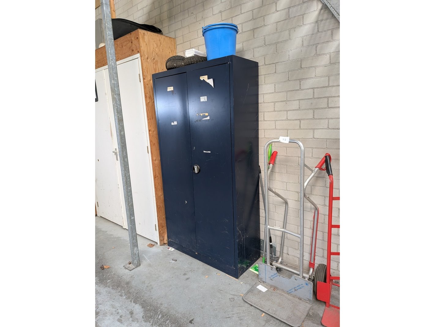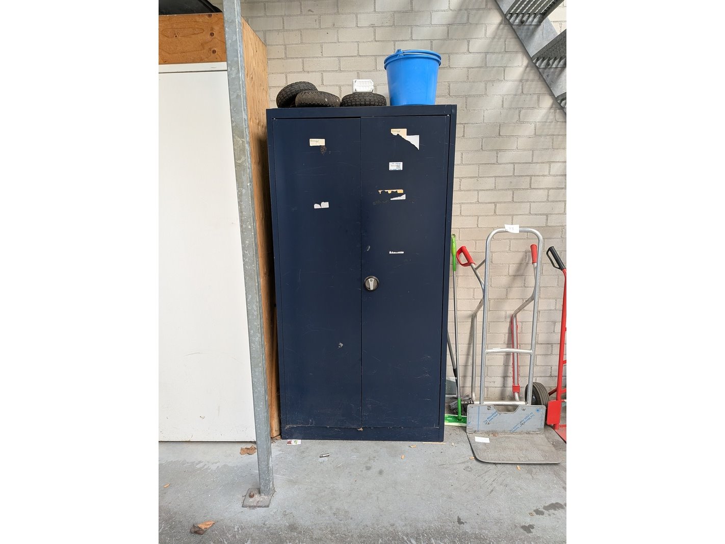 Product: Werkplaatskast met inhoud Afmeting: (hxbxd) ca. 196 x 100 x 43 cm Specificaties: Inhoud bestaande uit o.a. steekwagen banden, oliën, gereedschap, etc. Inclusief 2x steekwagen onderdelen, 2x autoband met velg 205/75 R 16 C