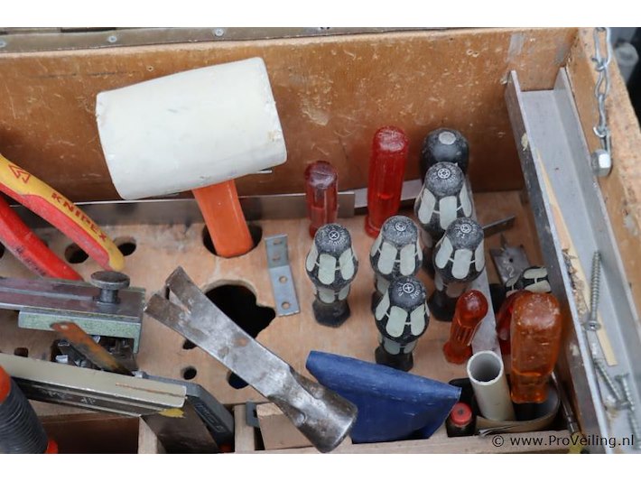 Mobiele gereedschapskist incl. diverse handgereedschappen o.a. zaag, tangen & schroevendraaiers; afmetingen kist ca. 60x40x70cm; zie afbeeldingen.