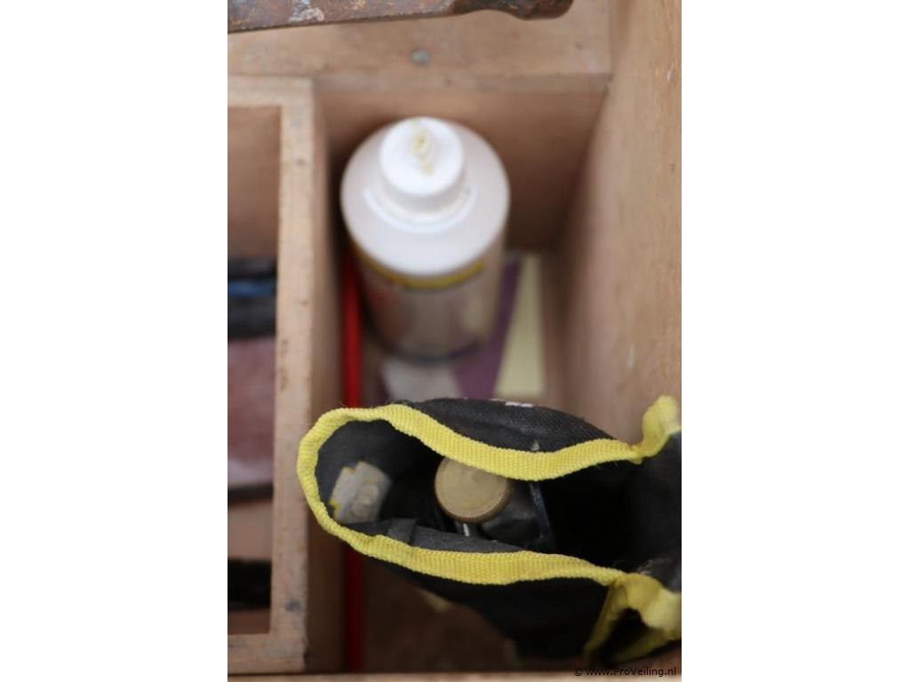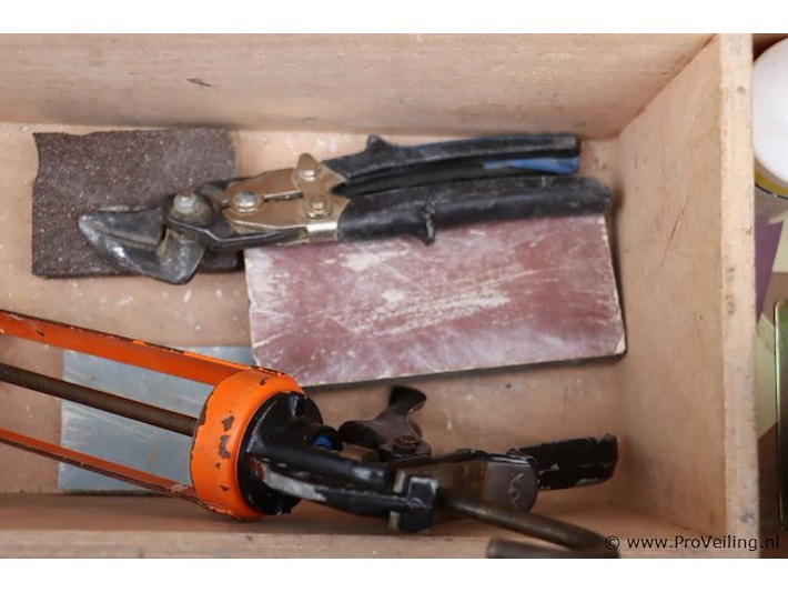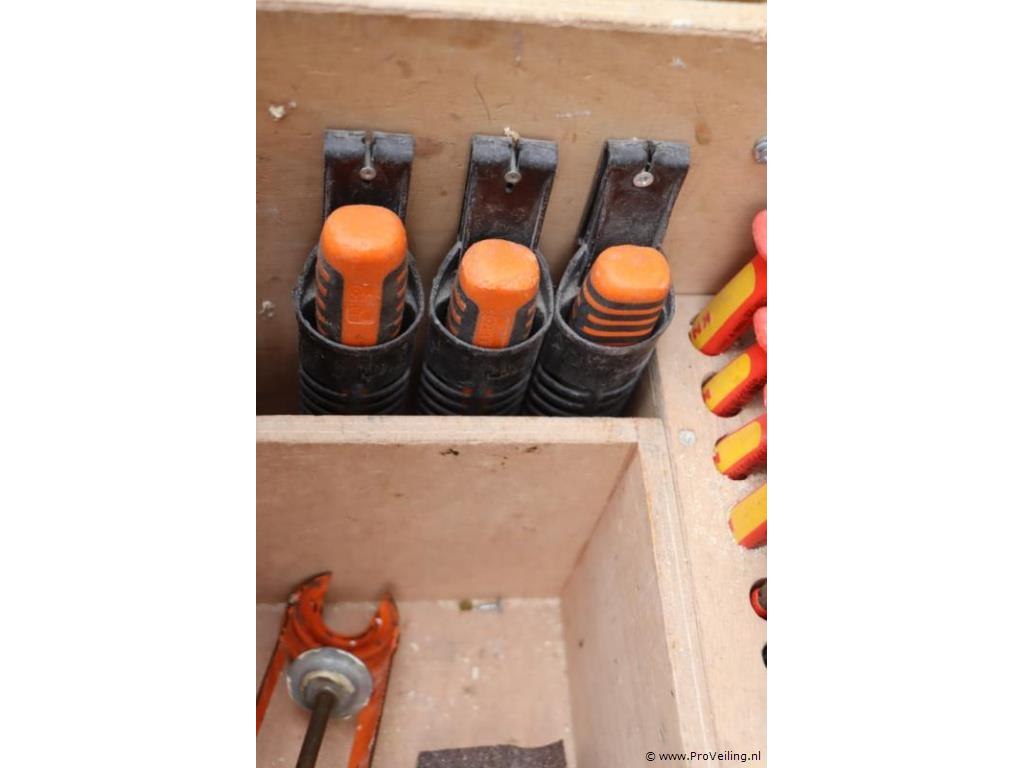 Bestaande uit o.a. tangen, gatenzaag & schroevendraaiers; afmetingen kist ca. 60x40x55cm; zie afbeeldingen.