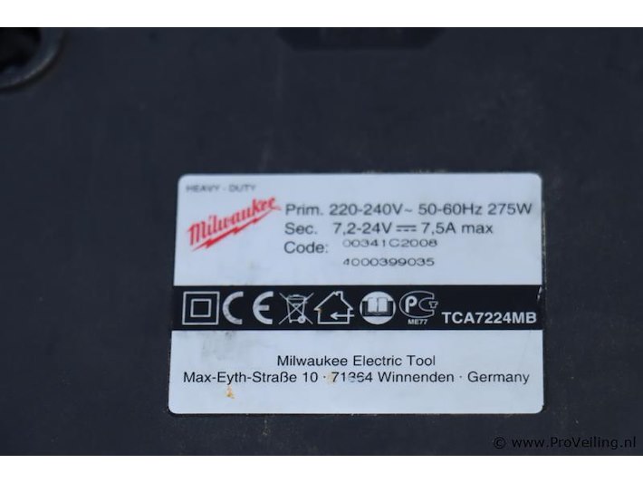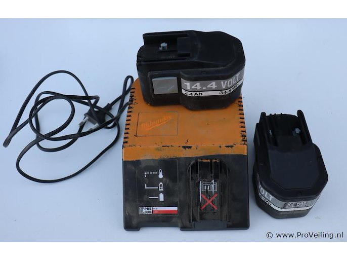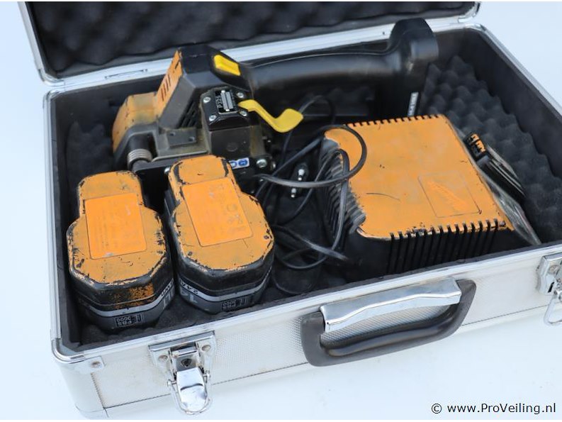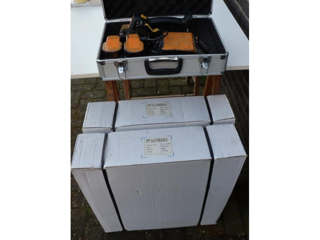 Milwaukee Accu omsnoeringsapparaat P325 incl. opbergkoffer & omsnoeringsband (2 rollen); incl. 2x 14.4V accu's & oplaadstation; zie afbeeldingen.