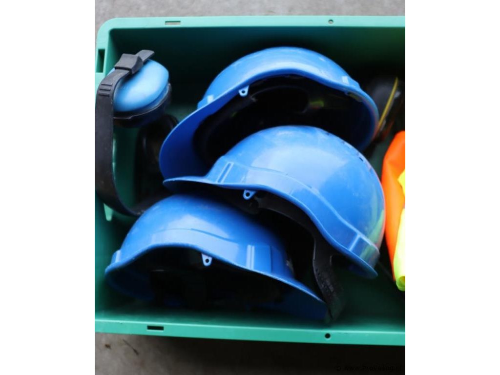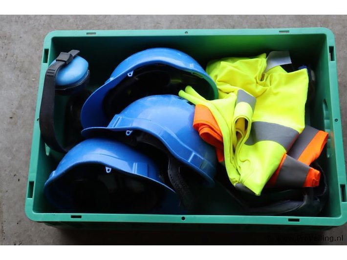 Bestaande uit o.a. gehoorbeschermer, bouwhelmen & veiligheidsvestjes; zie afbeeldingen.