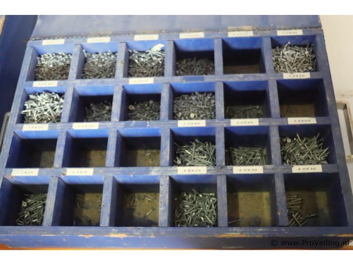 Houten assortimentskist incl. inhoud bestaande uit diverse schroeven