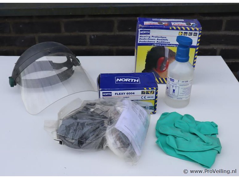 Partij persoonlijke beschermingsmiddelen o.a. honeywell flexy veiligheidsbril 6004, gehoorbeschermer & handschoenen