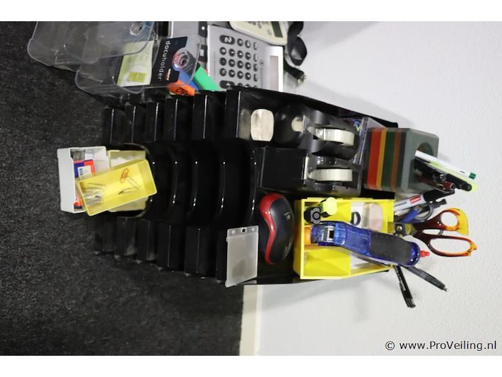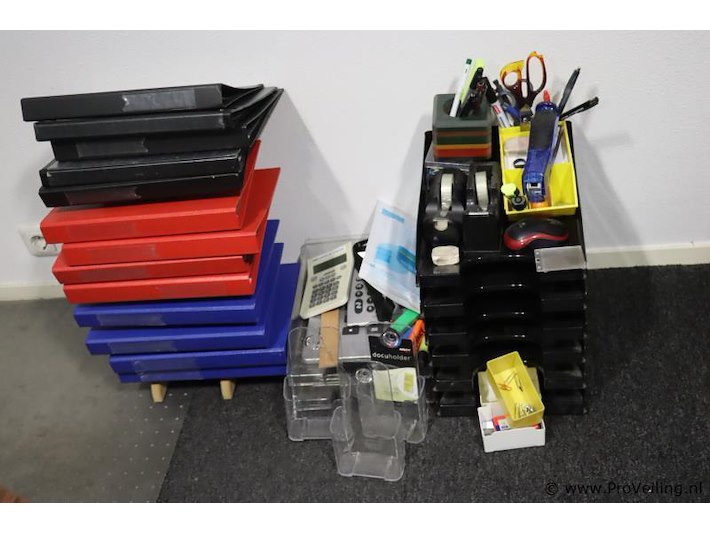 Partij kantoorbenodigdheden o.a. rekenmachines, markeerstiften, mappen & archiveerbakken