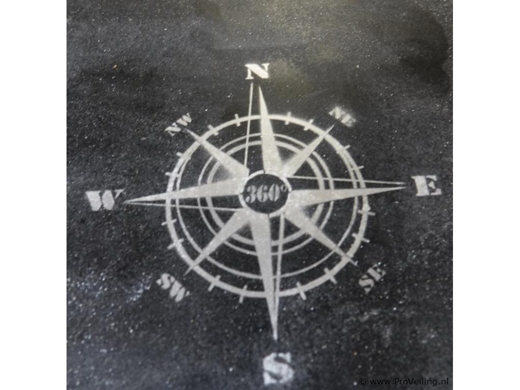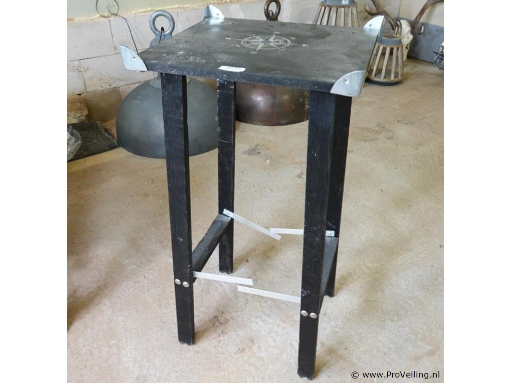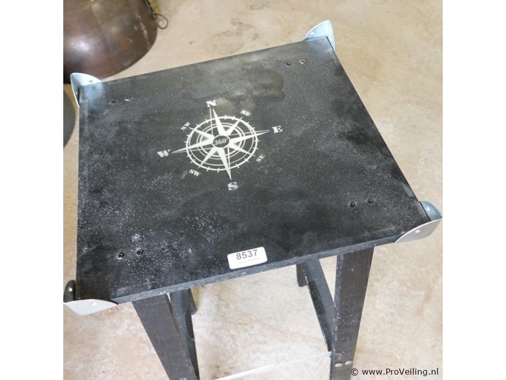 Plantenstandaard met metalen hoekverstevigingen en een kompasroos-afbeelding op het tafelblad.
