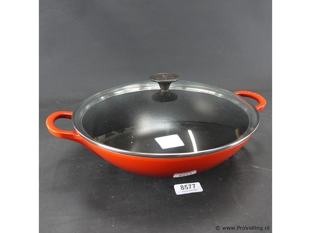 Le Creuset geëmailleerde gietijzeren wok met glazen deksel. Weinig gebruikt. H12cm/D34cm/. Verwachte opbrengst € 100,00 - € 150,00. Lees a.u.b. ook de extra veilinginformatie voor deze veiling. G-E-E-N transport of bezorging door Proveiling mogelijk. Eventueel transport of bezorging alleen door u zelf te regelen via b.v. www.brenger.nl .