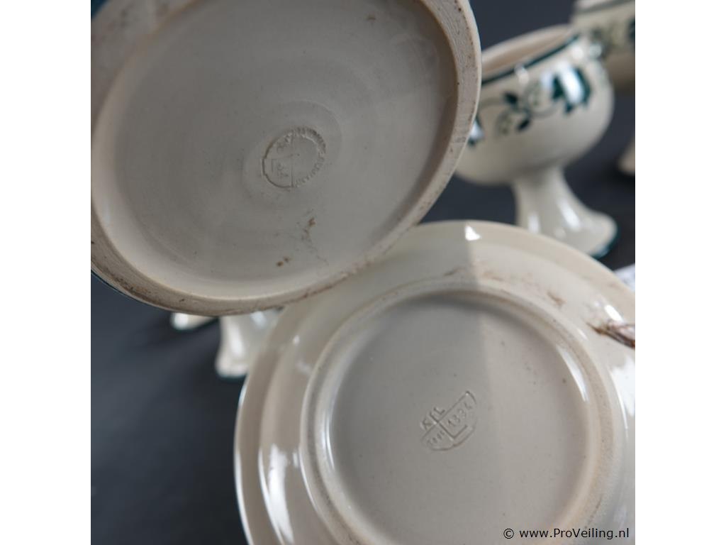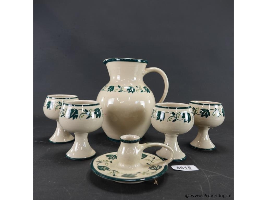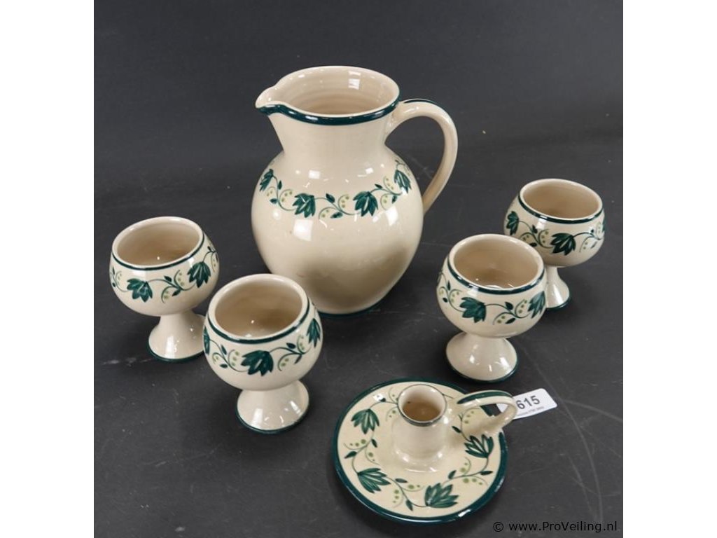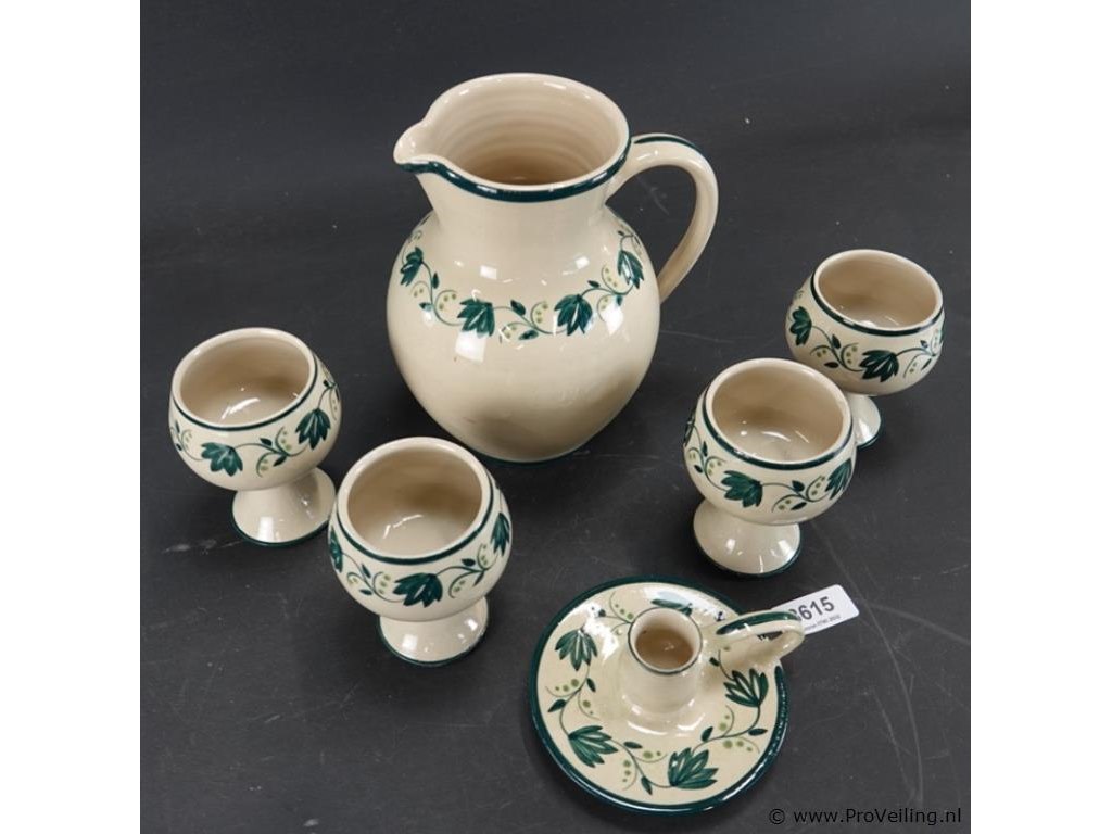 Royal Boch?. schenkkan met kelkkommen en kandelaar. In groen-witte Aquarelle of Boerenbont patroon. . H22cm/. Verwachte opbrengst € 10,00 - € 15,00. Lees a.u.b. ook de extra veilinginformatie voor deze veiling. G-E-E-N transport of bezorging door Proveiling mogelijk. Eventueel transport of bezorging alleen door u zelf te regelen via b.v. www.brenger.nl .