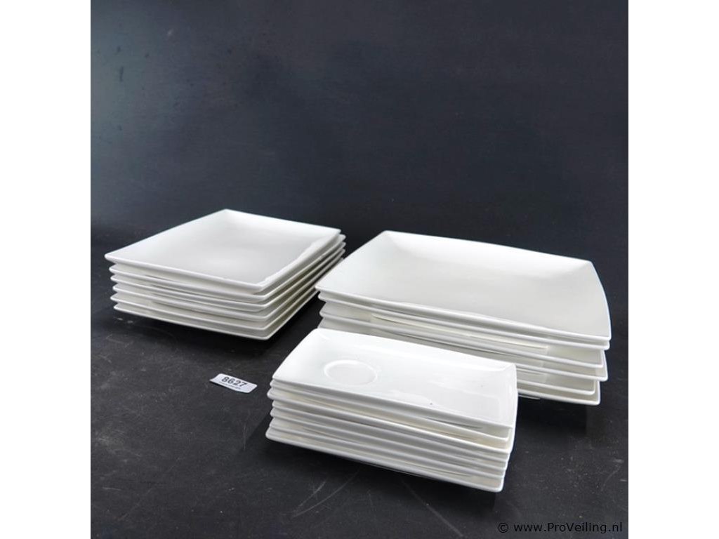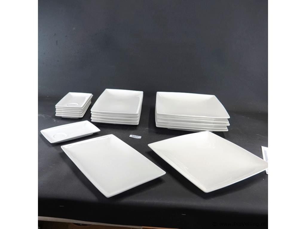 Verzameling witte, vierkante en rechthoekige serviesdelen