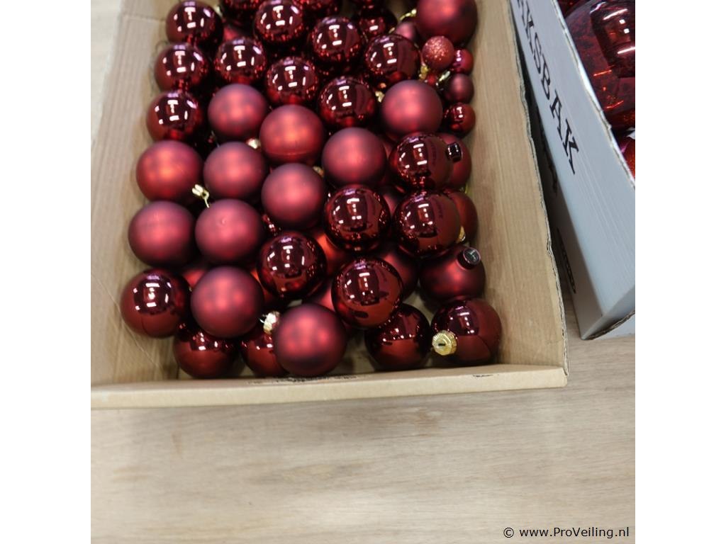 Grote partij rode kerstballen in 2 volle verhuisdozen