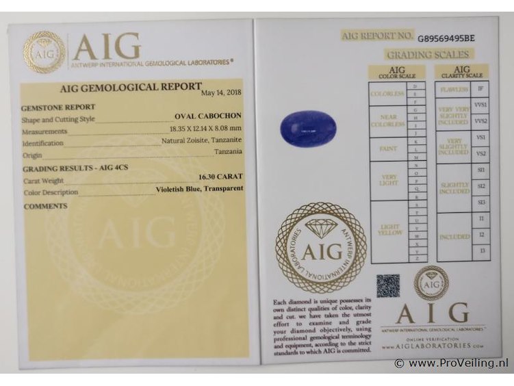 - Certificate No.: G89569495BE - Shape: Oval - Total Carat weight: 16.3 ct - No. of Stones: 1 - Color: Violetish Blue - Treatment: Not mentioned in the report Additional information: Highly magnified pictures taken with a macro lens intended to show any imperfections less visible to the naked eye. Refer to the measurements for actual size Shipping information: Fully insured shipping within the EU for EUR 25. Combined shipping possible