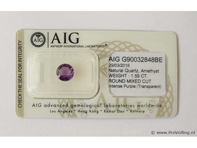 - Certificate No.: G90032848BE - Shape: Round - Total Carat weight: 1.59 ct - No. of Stones: 1 - Color: Intense Purple - Treatment: Not mentioned in the report Additional information: Highly magnified pictures taken with a macro lens intended to show any imperfections less visible to the naked eye. Refer to the measurements for actual size Shipping information: Fully insured shipping within the EU for EUR 25. Combined shipping possible