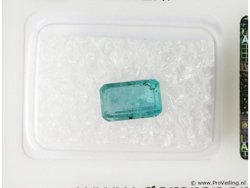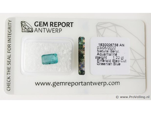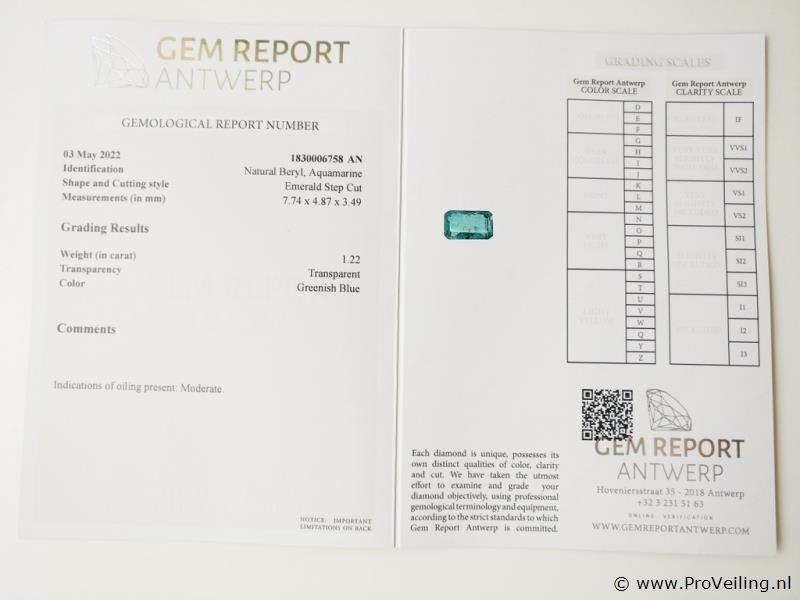 - Certificate No.: 1830006758AN - Shape: Emerald Step Cut - Total Carat weight: 1.22 ct - No. of Stones: 1 - Color: Greenish Blue (Transparent) - Treatment: Indications of oiling present: Moderate Additional information: Highly magnified pictures taken with a macro lens intended to show any imperfections less visible to the naked eye. Refer to the measurements for actual size Shipping information: Fully insured shipping within the EU for EUR 25. Combined shipping possible