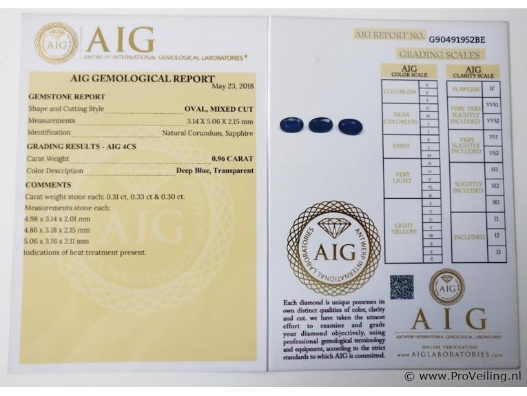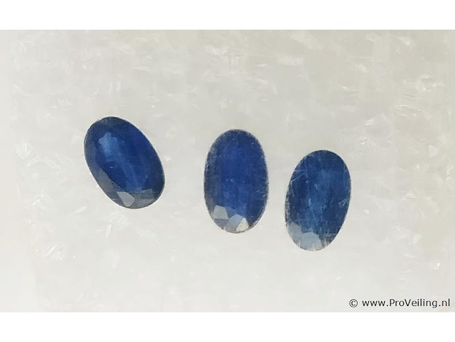 - Certificate No.: G90491952BE - Shape: Oval - Total Carat weight: 0.96 ct - No. of Stones: 3 - Color: Deep Blue - Treatment: Not mentioned in the report Additional information: Highly magnified pictures taken with a macro lens intended to show any imperfections less visible to the naked eye. Refer to the measurements for actual size Shipping information: Fully insured shipping within the EU for EUR 25. Combined shipping possible