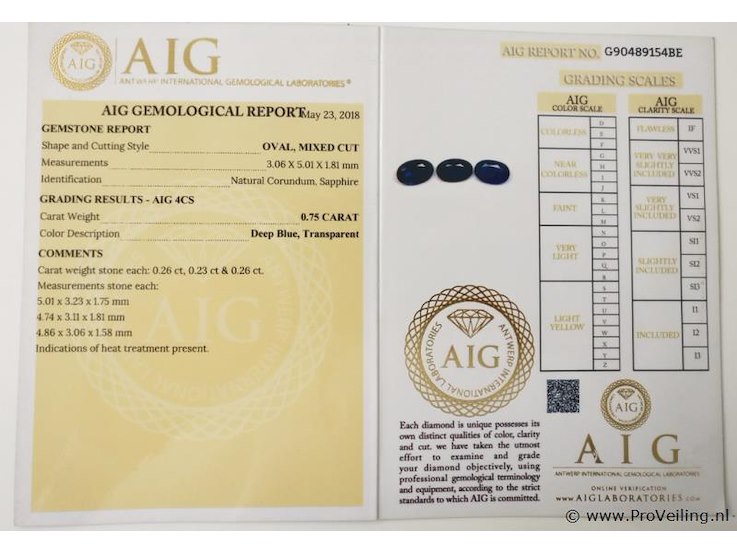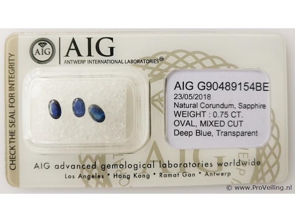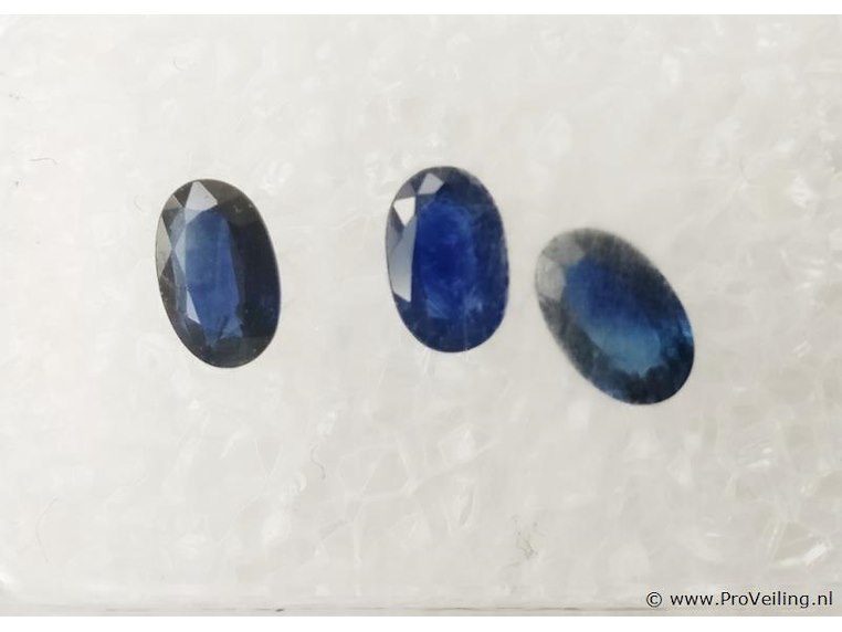 - Certificate No.: G90489154BE - Shape: Oval - Total Carat weight: 0.75 ct - No. of Stones: 3 - Color: Deep Blue - Treatment: Not mentioned in the report Additional information: Highly magnified pictures taken with a macro lens intended to show any imperfections less visible to the naked eye. Refer to the measurements for actual size Shipping information: Fully insured shipping within the EU for EUR 25. Combined shipping possible