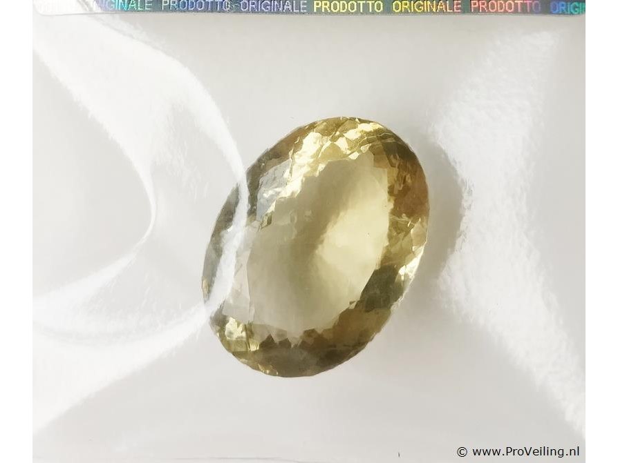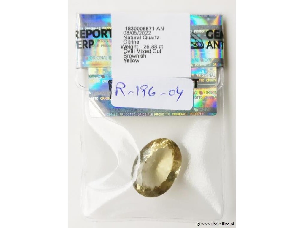 - Certificate No.: 1830006871AN - Shape: Oval Mixed Cut - Total Carat weight: 26.88 ct - No. of Stones: 1 - Color: Brownish Yellow (Transparent) - Treatment: Citrine is commonly Heated. Additional information: Highly magnified pictures taken with a macro lens intended to show any imperfections less visible to the naked eye. Refer to the measurements for actual size Shipping information: Fully insured shipping within the EU for EUR 25. Combined shipping possible