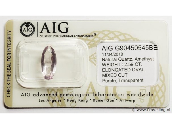 - Certificate No.: G90450545BE - Shape: Oval - Total Carat weight: 2.59 ct - No. of Stones: 1 - Color: Purple - Treatment: Not mentioned in the report Additional information: Highly magnified pictures taken with a macro lens intended to show any imperfections less visible to the naked eye. Refer to the measurements for actual size Shipping information: Fully insured shipping within the EU for EUR 25. Combined shipping possible