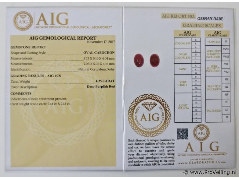 - Certificate No.: G88969134BE - Shape: Oval Cabochon - Total Carat weight: 4.25 ct - No. of Stones: 2 - Color: Deep Purplish Red - Treatment: Not mentioned in the report Additional information: Highly magnified pictures taken with a macro lens intended to show any imperfections less visible to the naked eye. Refer to the measurements for actual size Shipping information: Fully insured shipping within the EU for EUR 25. Combined shipping possible
