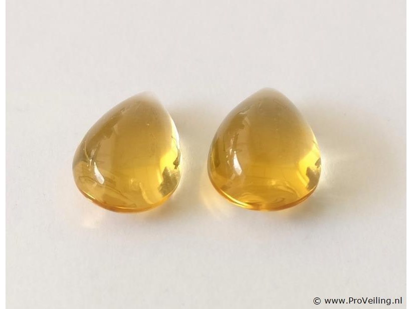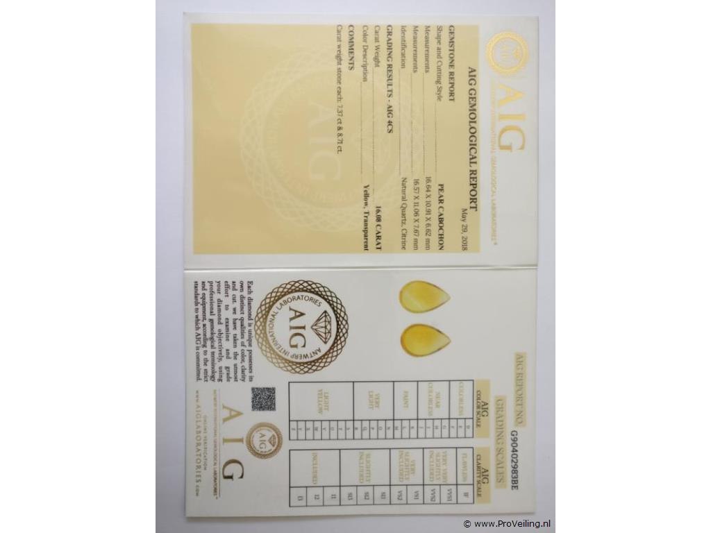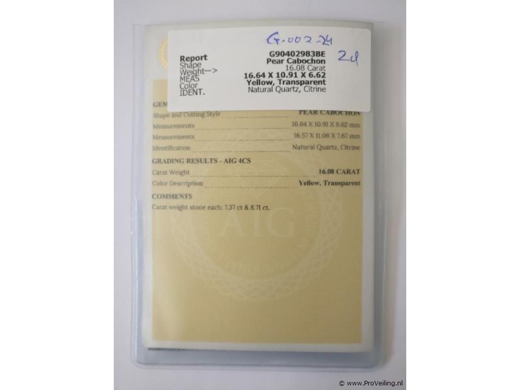 - Certificate No.: G90402983BE - Shape: Pear - Total Carat weight: 16.08 ct - No. of Stones: 2 - Color: Yellow - Treatment: Not mentioned in the report Additional information: Highly magnified pictures taken with a macro lens intended to show any imperfections less visible to the naked eye. Refer to the measurements for actual size Shipping information: Fully insured shipping within the EU for EUR 25. Combined shipping possible