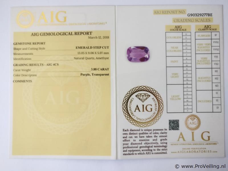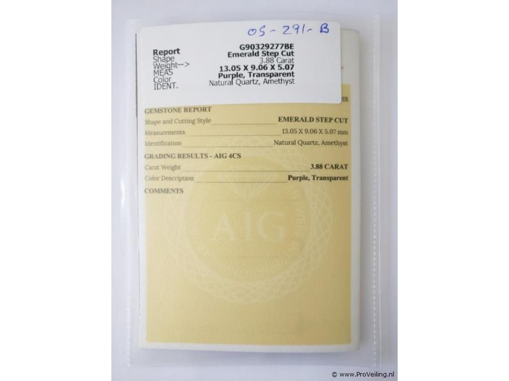 - Certificate No.: G90329277BE - Shape: Emerald - Total Carat weight: 3.88 ct - No. of Stones: 1 - Color: Purple - Treatment: Not mentioned in the report Additional information: Highly magnified pictures taken with a macro lens intended to show any imperfections less visible to the naked eye. Refer to the measurements for actual size Shipping information: Fully insured shipping within the EU for EUR 25. Combined shipping possible