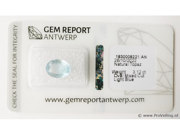 - Certificate No.: 1830008221AN - Shape: Oval Mixed Cut - Total Carat weight: 3.12 ct - No. of Stones: 1 - Color: Light Blue (Transparent) - Treatment: Commonly Treated Additional information: Highly magnified pictures taken with a macro lens intended to show any imperfections less visible to the naked eye. Refer to the measurements for actual size Shipping information: Fully insured shipping within the EU for EUR 25. Combined shipping possible