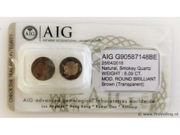 - Certificate No.: G90587148BE - Shape: Round - Total Carat weight: 6.09 ct - No. of Stones: 2 - Color: Brown - Treatment: Not mentioned in the report Additional information: Highly magnified pictures taken with a macro lens intended to show any imperfections less visible to the naked eye. Refer to the measurements for actual size Shipping information: Fully insured shipping within the EU for EUR 25. Combined shipping possible