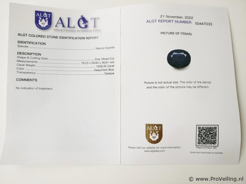 - Certificate No.: 50447033 - Shape: Oval Mixed Cut - Total Carat weight: 1838.35 ct - No. of Stones: 1 - Color: Deep/Dark Blue (Opaque) - Treatment: No indication of treatments Additional information: Highly magnified pictures taken with a macro lens intended to show any imperfections less visible to the naked eye. Refer to the measurements for actual size Shipping information: Fully insured shipping within the EU for EUR 25. Combined shipping possible