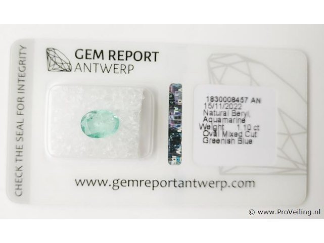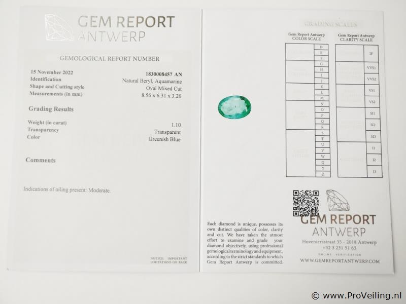 - Certificate No.: 1830008457AN - Shape: Oval Mixed Cut - Total Carat weight: 1.1 ct - No. of Stones: 1 - Color: Greenish Blue (Transparent) - Treatment: Indications of oiling present: Moderate Additional information: Highly magnified pictures taken with a macro lens intended to show any imperfections less visible to the naked eye. Refer to the measurements for actual size Shipping information: Fully insured shipping within the EU for EUR 25. Combined shipping possible