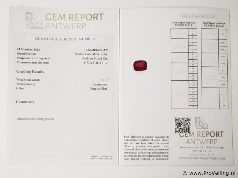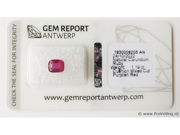 - Certificate No.: 1830008205AN - Shape: Cushion Mixed Cut - Total Carat weight: 1.19 ct - No. of Stones: 1 - Color: Purplish Red (Transparent) - Treatment: Indications of heating present Additional information: Highly magnified pictures taken with a macro lens intended to show any imperfections less visible to the naked eye. Refer to the measurements for actual size Shipping information: Fully insured shipping within the EU for EUR 25. Combined shipping possible