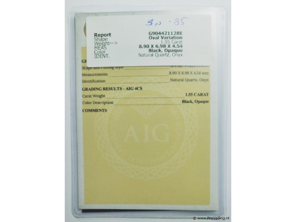 - Certificate No.: G90442112BE - Shape: Oval - Total Carat weight: 1.55 ct - No. of Stones: 1 - Color: Black - Treatment: Not mentioned in the report Additional information: Highly magnified pictures taken with a macro lens intended to show any imperfections less visible to the naked eye. Refer to the measurements for actual size Shipping information: Fully insured shipping within the EU for EUR 25. Combined shipping possible