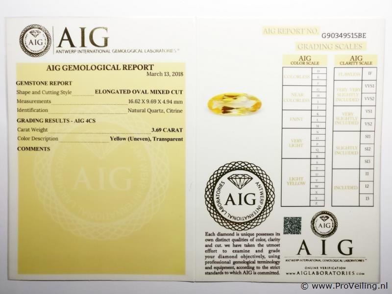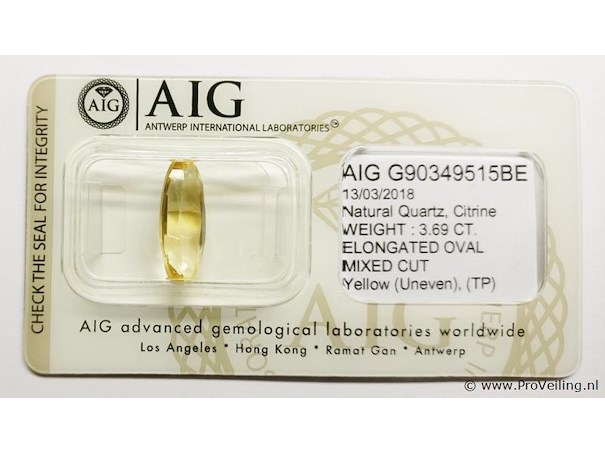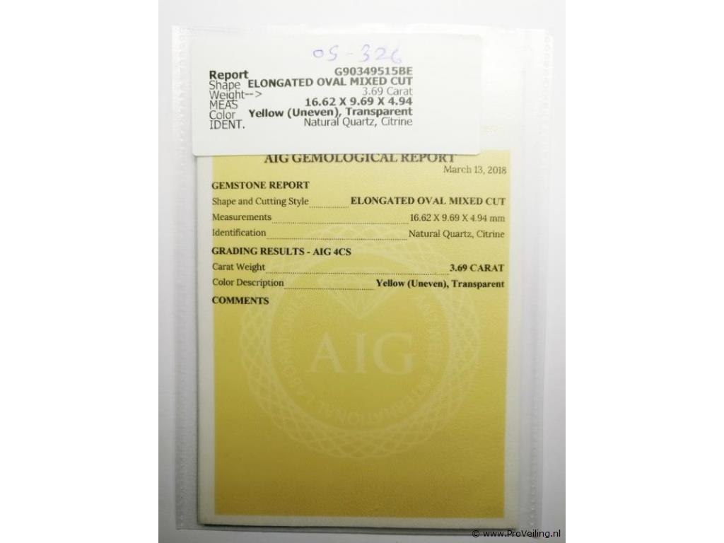- Certificate No.: G90349515BE - Shape: Oval - Total Carat weight: 3.69 ct - No. of Stones: 1 - Color: Yellow - Treatment: Not mentioned in the report Additional information: Highly magnified pictures taken with a macro lens intended to show any imperfections less visible to the naked eye. Refer to the measurements for actual size Shipping information: Fully insured shipping within the EU for EUR 25. Combined shipping possible