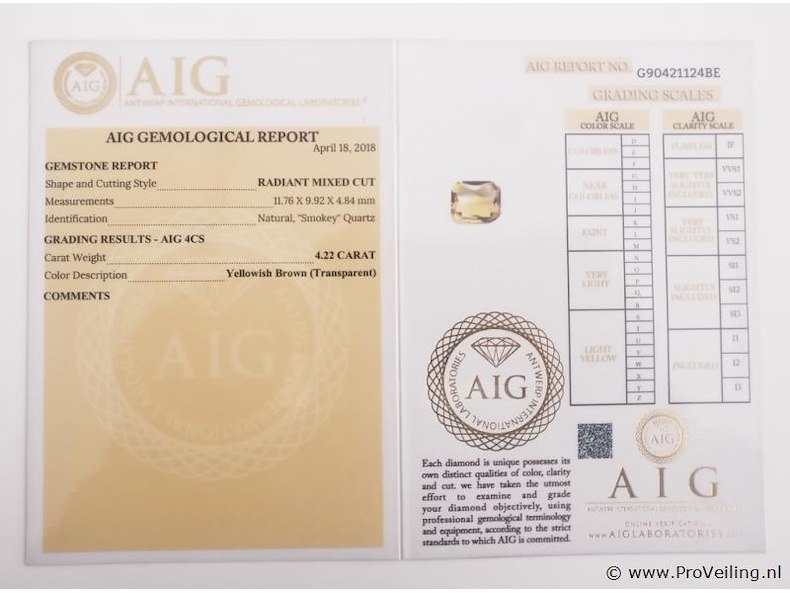 - Certificate No.: G90421124BE - Shape: Radiant - Total Carat weight: 4.22 ct - No. of Stones: 1 - Color: Yellowish Brown - Treatment: Not mentioned in the report Additional information: Highly magnified pictures taken with a macro lens intended to show any imperfections less visible to the naked eye. Refer to the measurements for actual size Shipping information: Fully insured shipping within the EU for EUR 25. Combined shipping possible