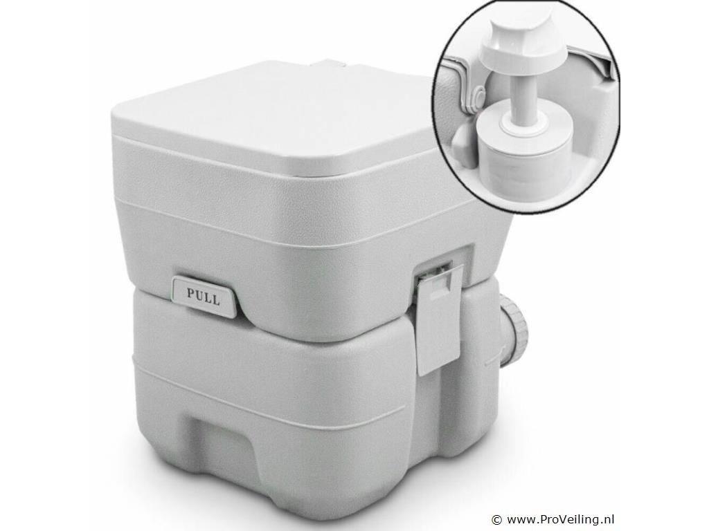Camping toilet Het praktische, draagbare campingtoilet is de ideale metgezel voor op de camping, in de tuin, in de stacaravan, thuis, op festivals, op vakantie, buitenshuis en onderweg. Hygiënisch en schoon doorspoelen is mogelijk door middel van een plunjerpomp, tevens heeft het toilet een dubbel spoelsysteem. Ook de zithoogte van 415 mm biedt een aangenaam zitcomfort. De vuilwatertank wordt geleegd via een grote afvoeropening. Het toilet heeft een verswatertank van 10L en een vuilwatertank van 20L. Met een gewicht van slechts 5 kg is hij ook erg licht. Het toilet is geïmpregneerd met een plastic afdichting, voor het eerste gebruik eenvoudig met een droge doek afvegen. TECHNISCHE SPECIFICATIES Vuilwatertank: 20L Verswatertank: 10L Afmetingen (H/B/D): 415 x 365 x 420 mm Zithoogte: 415 mm Maximale belasting: 200 kg Maximale belasting: polyethyleen met hoge dichtheid, polypropyleen Kleur: lichtgrijs LEVERINGSOMVANG ? 1x campingtoilet