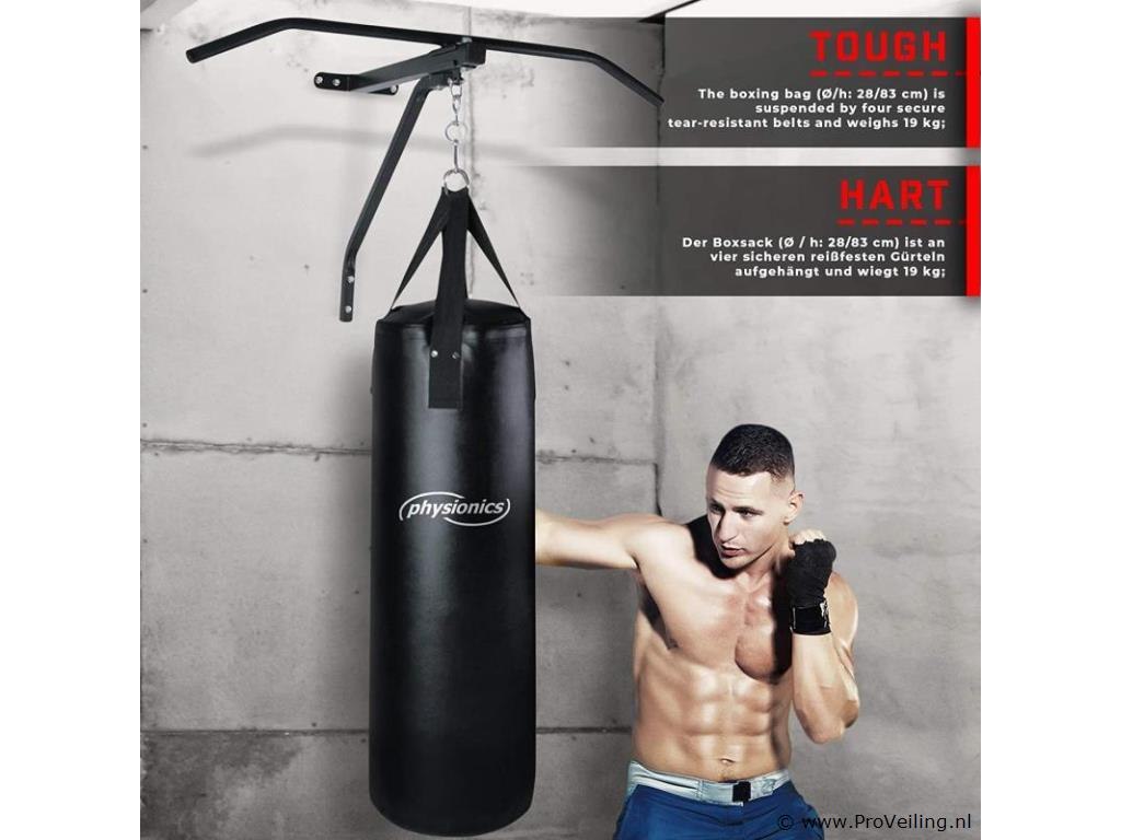 Deze set bestaat uit een optrekstang en een bokszak, die zowel voor beginners als professionals geschikt is. Gebruikers van deze sportuitrusting kunnen complete trainingen van verschillende spiergroepen uitvoeren door deze 2 gereedschappen effectief te gebruiken. Je kunt je algemene spieren ontwikkelen en bovendien na een lange dag spanning ontlasten. De pull-up stang is gemaakt van robuust staal, terwijl de gevulde bokszak is gemaakt van kunstleer. De houder is eenvoudig te monteren, zodat je met de training kunt beginnen zodra je thuiskomt. Geschikt voor beginners en professionals. Stabiele constructie. Eenvoudige montage. Versterkte kruisnaden met klinknagels. Maximale belastbaarheid: 120 kg. Technische gegevens: Afmetingen optrekstang: ca. 82 / 56,5 / 53 cm Afmetingen bokszak (Ø / H): ca. 28 NL/83 cm Gewicht bokszak: ca. 19 kg. Totale hoogte: ca. 132 cm Totaal gewicht: optrekstang + bokszak: ca. 22,5 kg. Materiaal: staal. Stof: 100% polyurethaan. Kleur: zwart. Inhoud levering: 1 x bokszak met houder KLMZ02. 1 x handleiding in meerdere talen (DE / FR / EN / ES). Opmerking: Geen verzending buiten het schiereiland Montagemateriaal niet inbegrepen.