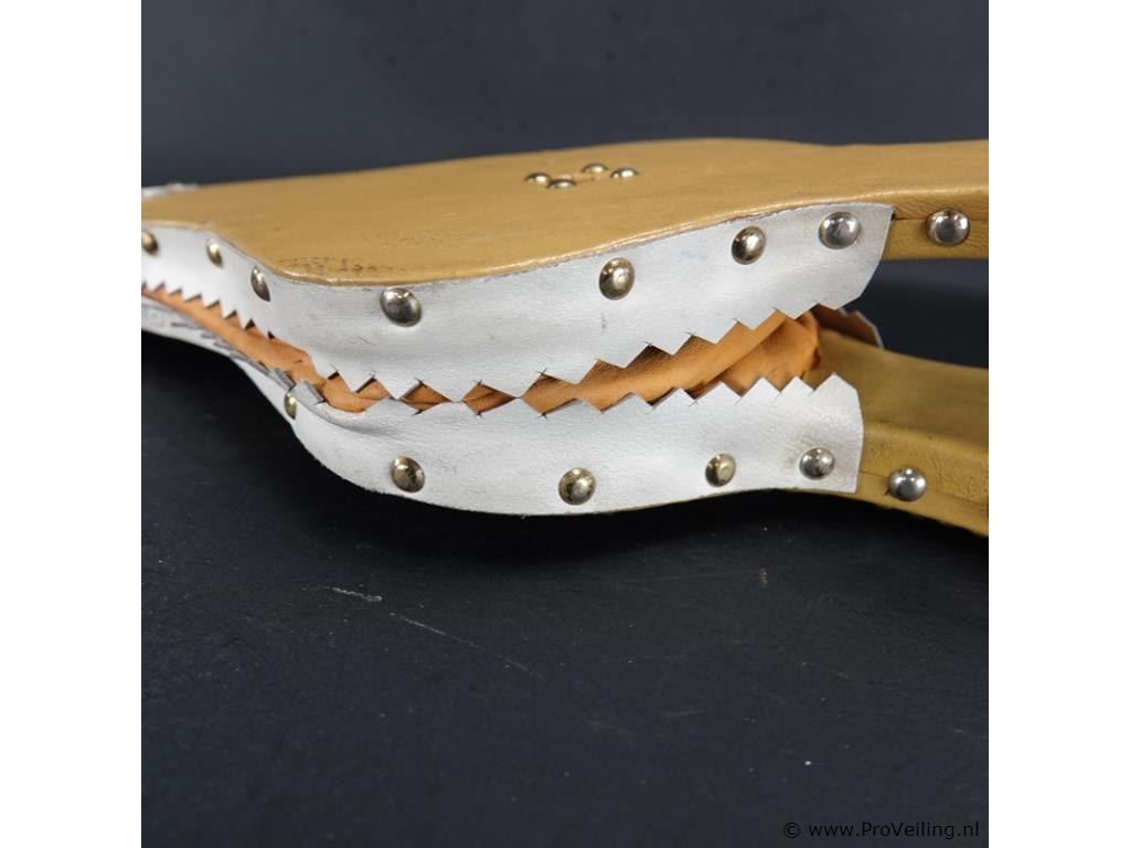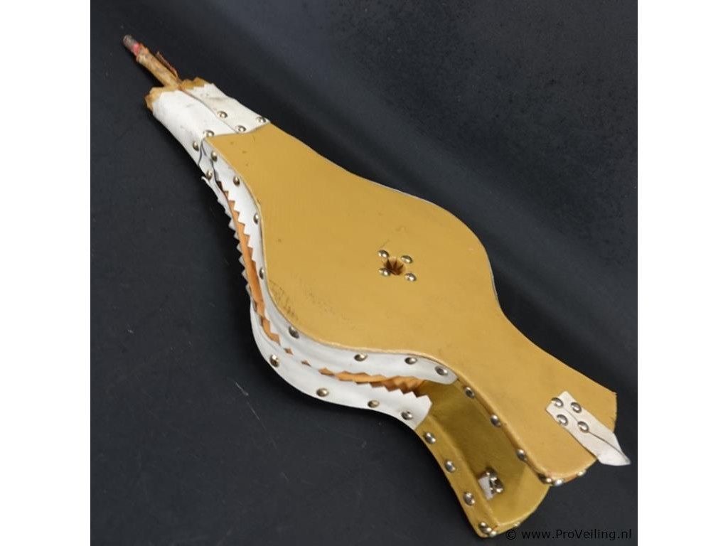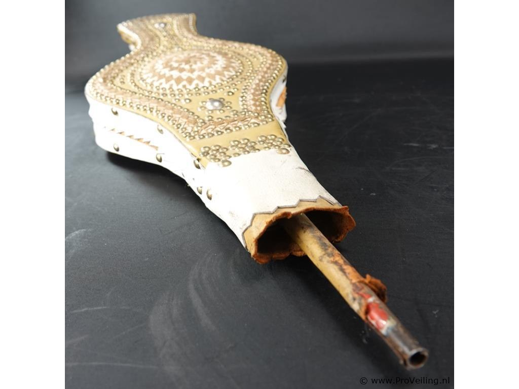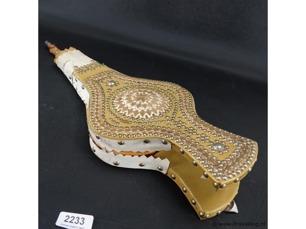 Marokkaanse blaasbalg (raboz), rijk versierd met leer en goudkleurige details.