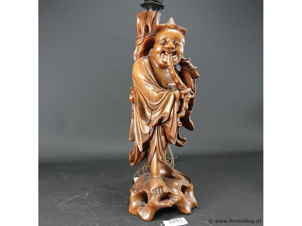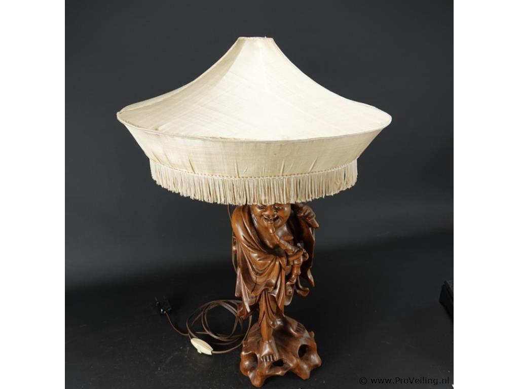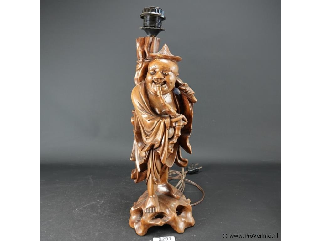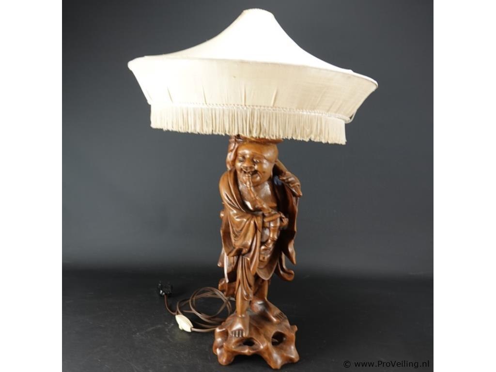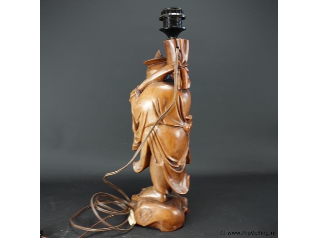 Antieke houten lampvoet chinees snijwerk van een wijze met bijzondere pagodekap