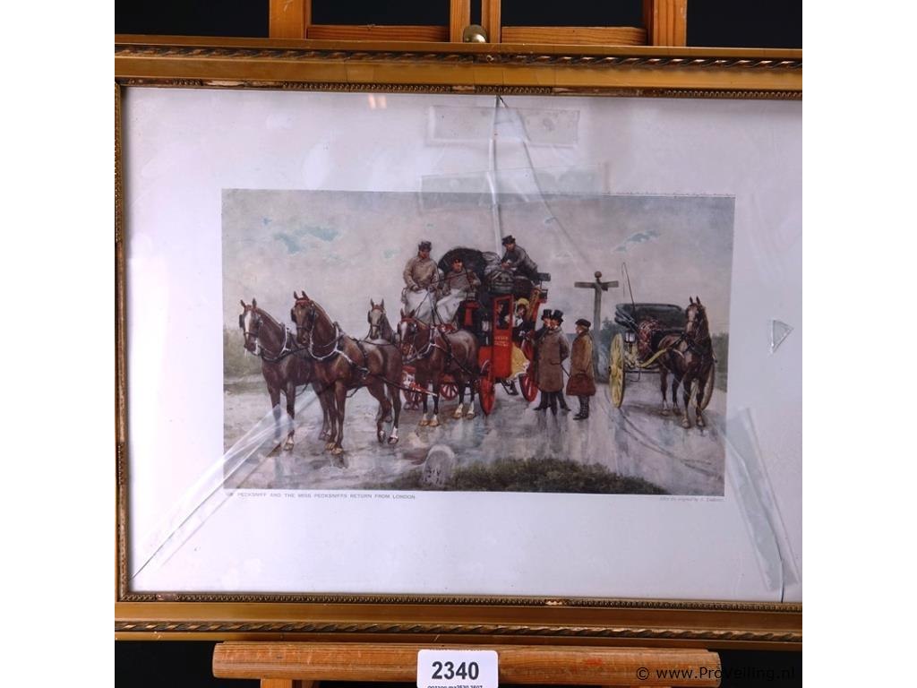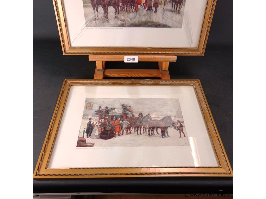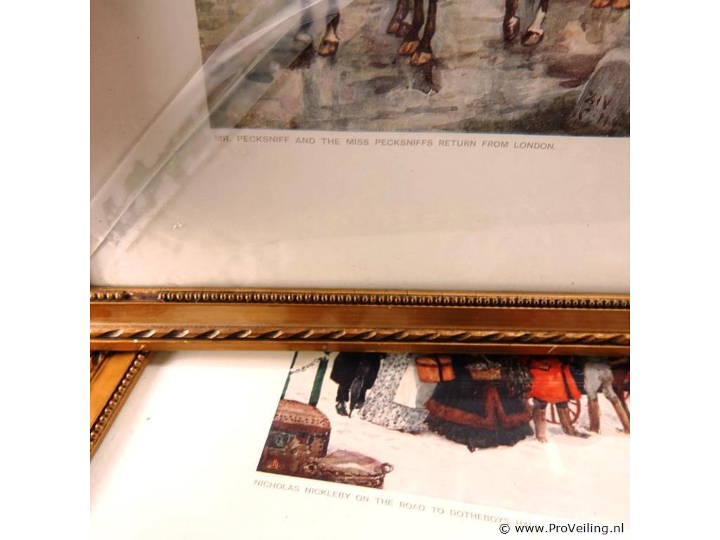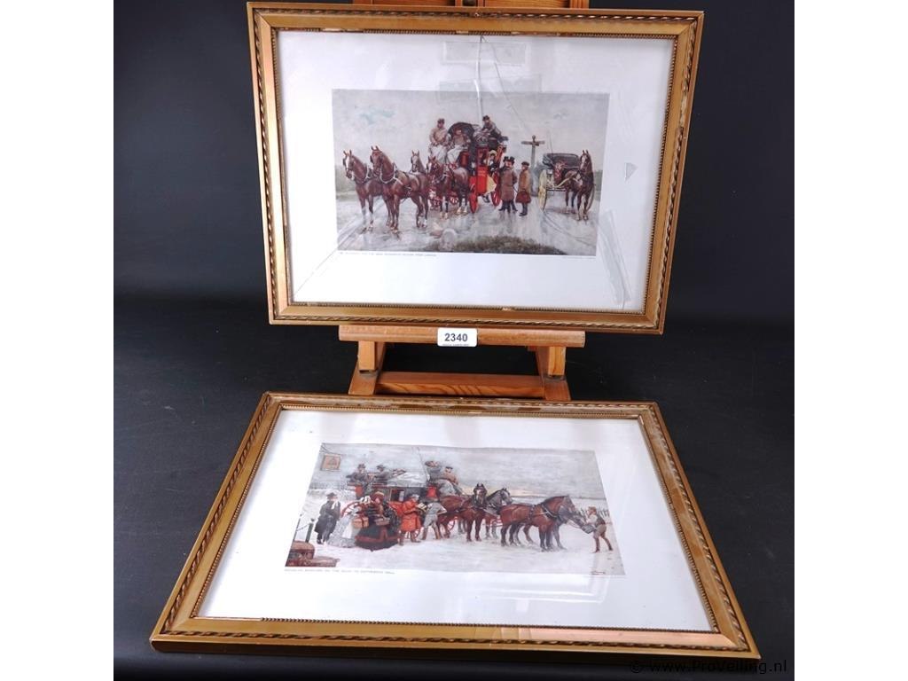 2 oude prenten in passe-partout, achter glas en in houten lijst