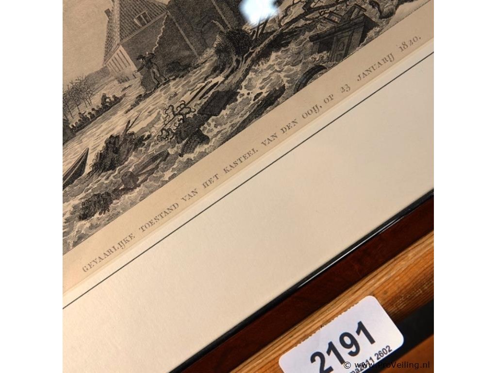 Antieke gravure gevaarlijke toestand van het kasteel van de ooij op 23 januari 1820