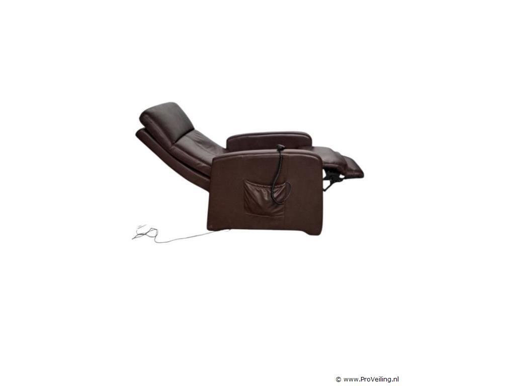 Elektrisch verstelbare relax- en sta-opstoel. Uitgevoerd in bruin leder. Verkeert in goede staat en werkt naar behoren. Comfortabel en gebruiksvriendelijk.