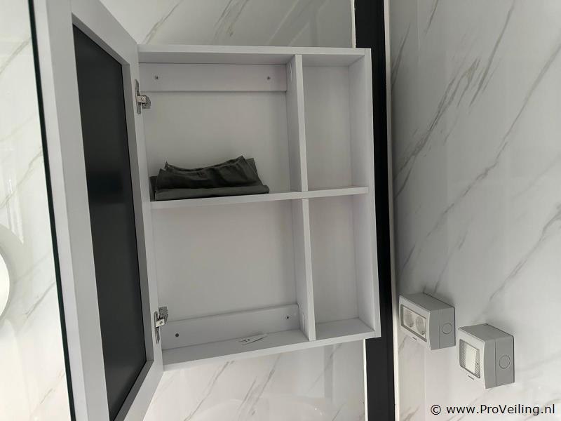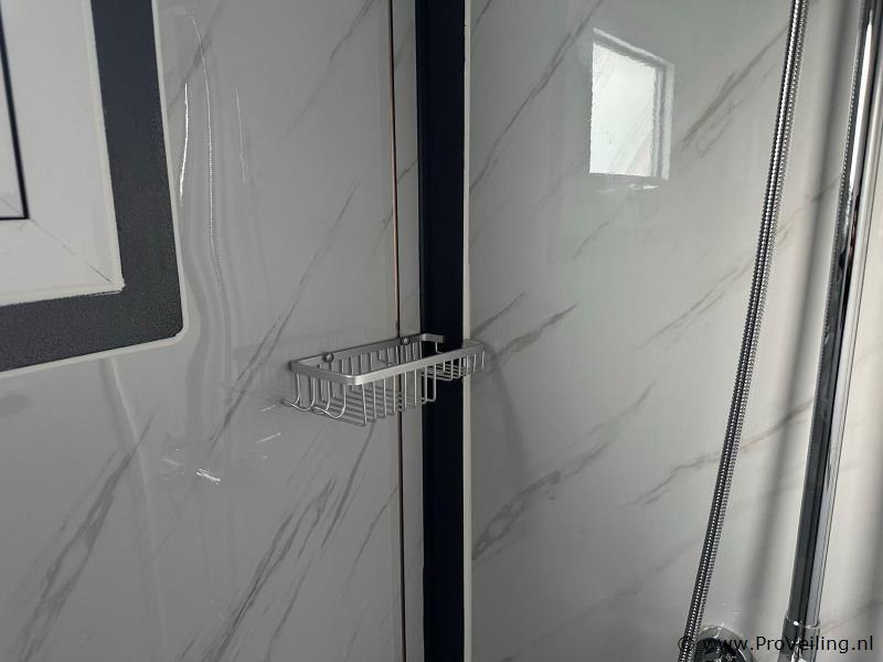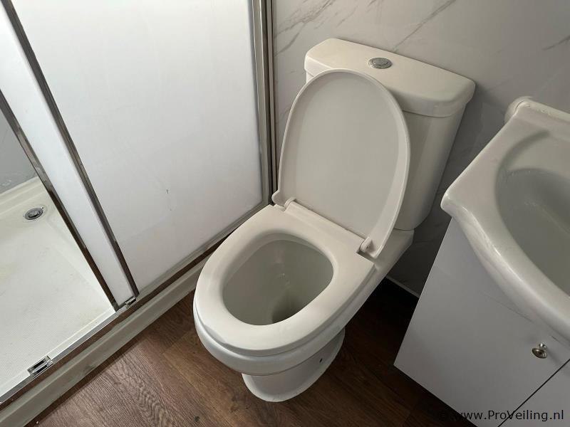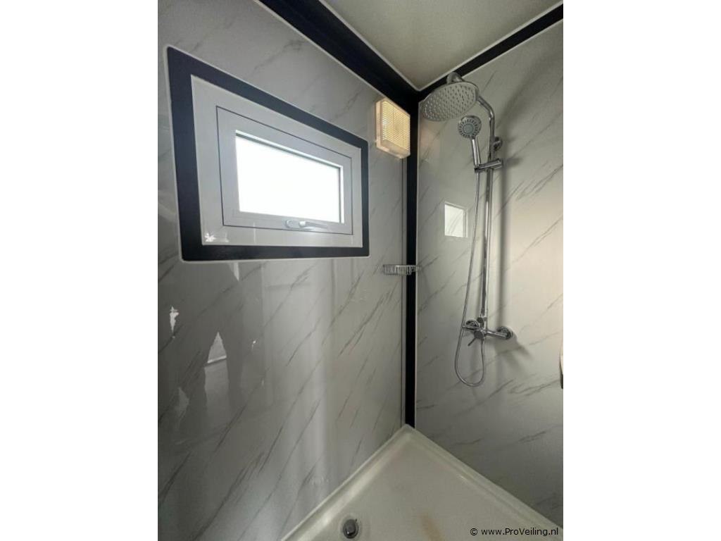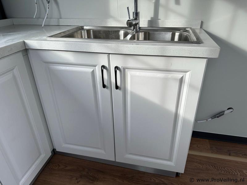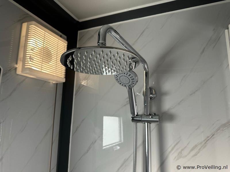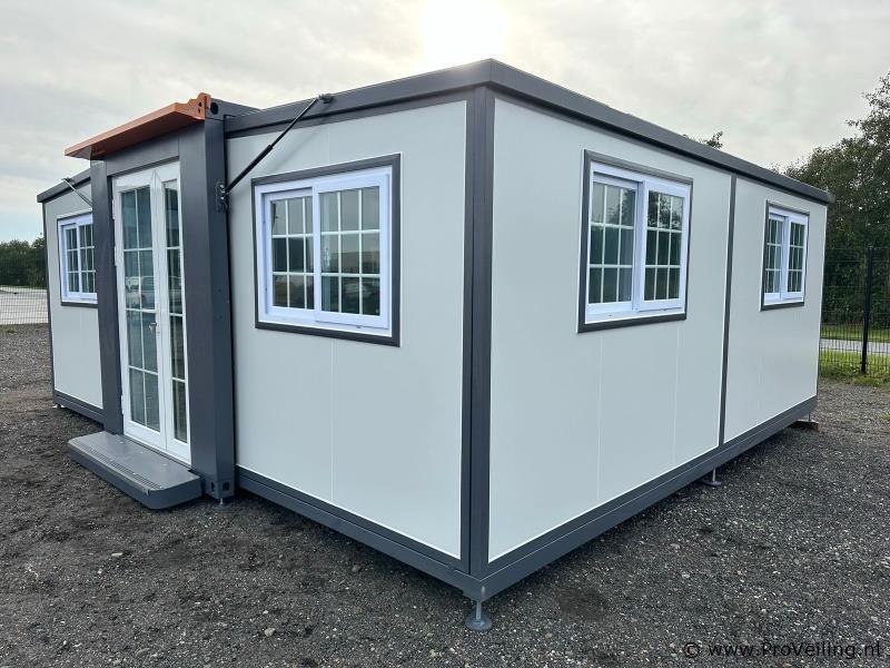 Type: Compleet Deluxe (19ft*20ft) Aantal ramen: 9 Keukenblok: true Toilet: true Eigen gewicht: 3550 kg Totale afmeting Lengte: 5860 mm Totale afmeting Breedte: 6220 mm Totale afmeting Hoogte: 2550 mm Additionele informatie: Voorzien van geïsoleerde wanden en dak; hoek keuken met boven kastjes; badkamer met toilet en regendouche; wastafel met spiegelkast en toiletgarnituur; vinyl vloer; ventilatiesysteem (230 Volt aansluiting); kunststof kozijnen met dubbele beglazing; afwateringsgoot; bordes; water, stroom en afvoer kan makkelijk aangesloten worden is voorbereid; afsluitbaar met sleutel en knopcilinder; afmetingen ingeklapt 5860x2110x2550 mm (transport afmetingen); ongebruikt