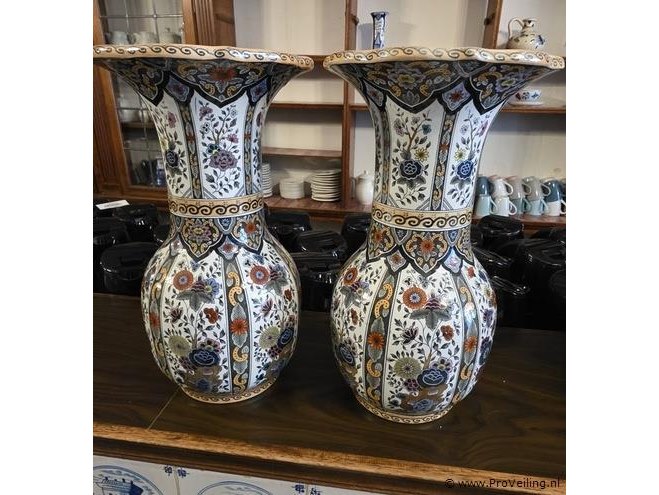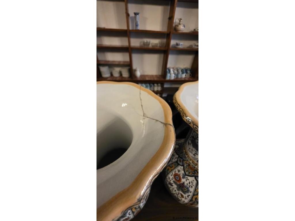 Aardewerken polychrome transferprint vaas met bloemmotief, hoogte ca. 35 cm, 1 vaas met herstellingen. Aantal 2 stuks.