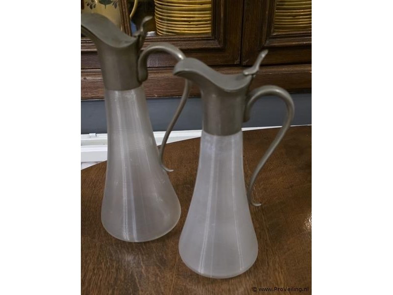 Matglazen karaf, geribbeld glas en tinnen klepdeksel en greep. Hoogte ca. 29 cm; aantal 2 stuks.
