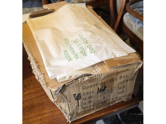 Waszakken, plastic, doos (aangebroken); aantal ca. 350 zakken , 1 doos.